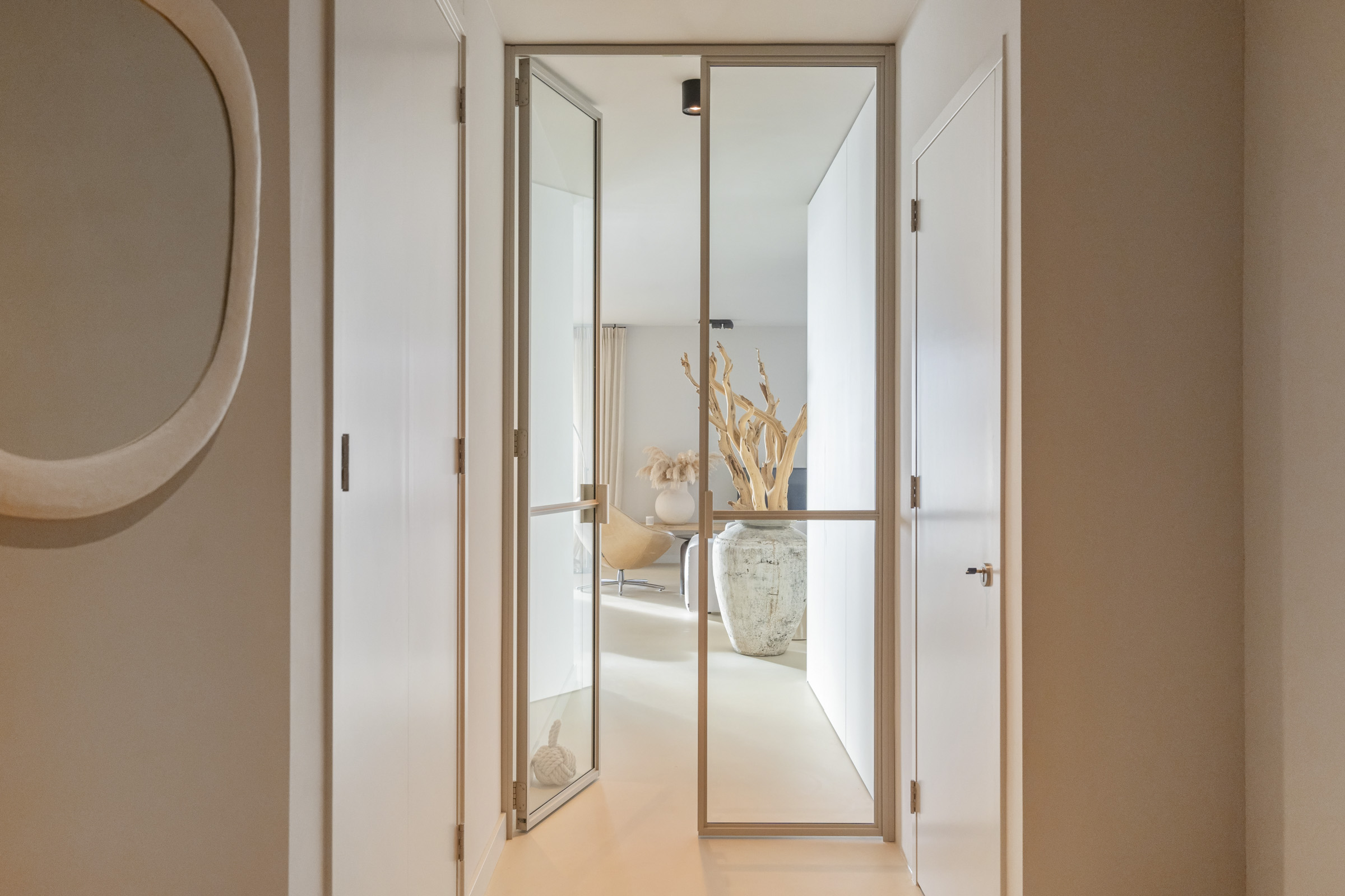 En dan is er nog een bonus: de zijvleugel. Zoals eerder genoemd, heeft deze vleugel een eigen entree, ideaal voor wie net wat meer privacy of zelfstandigheid zoekt. De ruimte is een kleinere variant van de master bedroom, maar met dezelfde hoogwaardige afwerking en sfeervolle uitstraling. In plaats van een schuifpui is hier een charmant Frans balkon, dat zorgt voor veel licht en een prettig gevoel van openheid. Ook deze kamer beschikt over een op maat gemaakte inloopkastenwand met volop ruimte voor kleding en accessoires. Aansluitend ligt de tweede luxe badkamer, voorzien van een douche met zowel hand- als regendouche, een stijlvol wastafelmeubel met verwarmde spiegel, strak geïntegreerde kranen en een derde toilet. Een prachtige, zelfstandige suite die het appartement extra allure en flexibiliteit geeft.