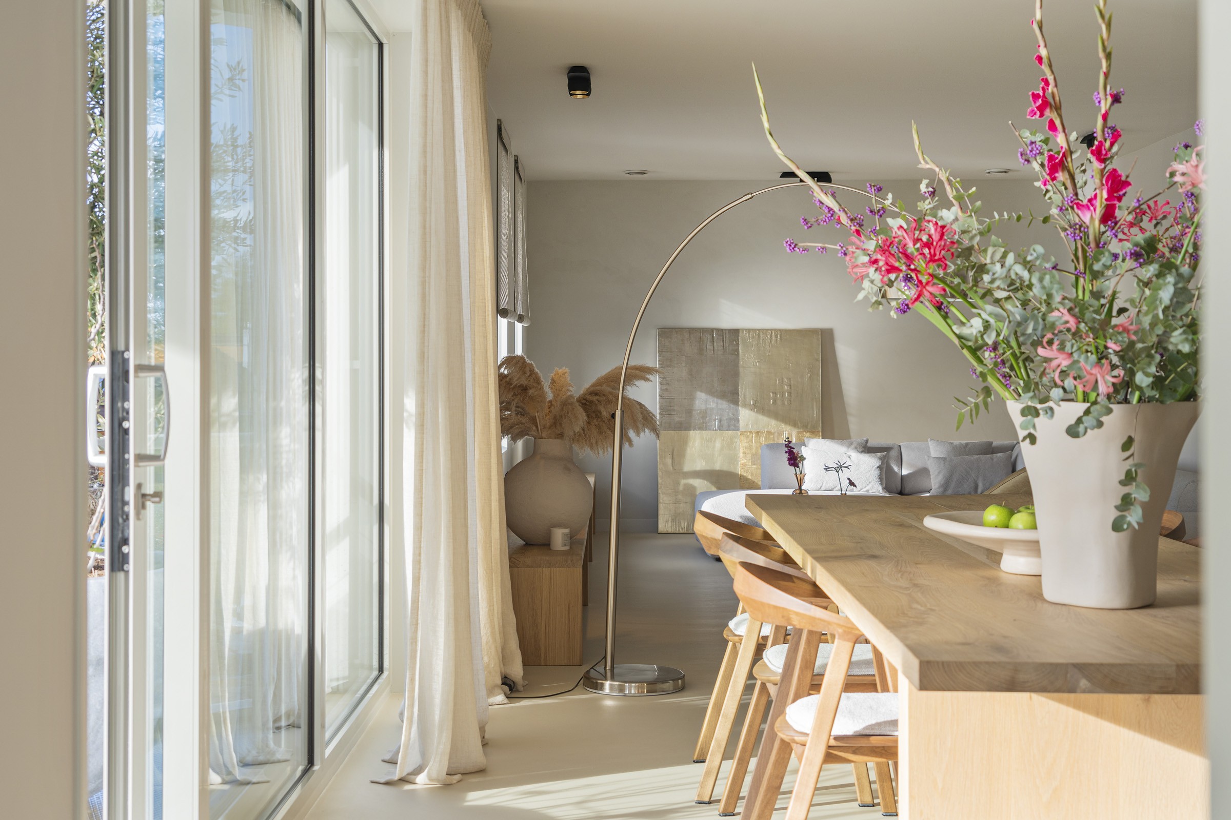 Vanuit de hal leiden de stoere stalen deuren u de woonkamer in, een ruimte die uitnodigt om even stil te staan. Het licht stroomt gul naar binnen en trekt uw blik als vanzelf naar buiten, waar het meer ligt te glanzen als een levend schilderij. Hier voelt u de ruimte, de rust en de luxe van vrij uitzicht. De woonkamer is royaal opgezet, met plek voor een grote loungebank waar u heerlijk kunt neerploffen en een royale eettafel die uitnodigt tot lange avonden met goed gezelschap. Alles ademt stijl en balans: langs één wand loopt een strakke, op maat gemaakte kastenwand die functionaliteit brengt en subtiel opgaat in het geheel. De Modular design opbouw lampen zorgen voor contrast en extra sfeer in woon- en slaapkamers.