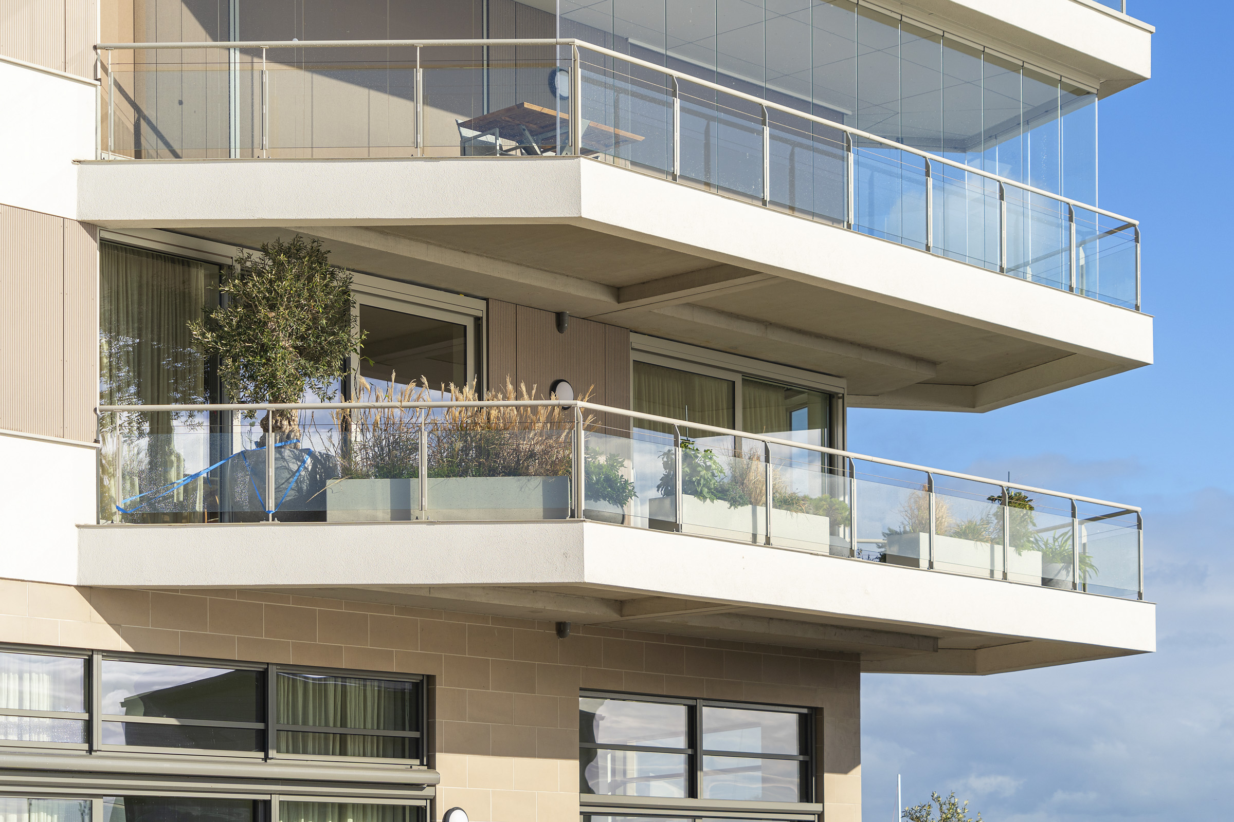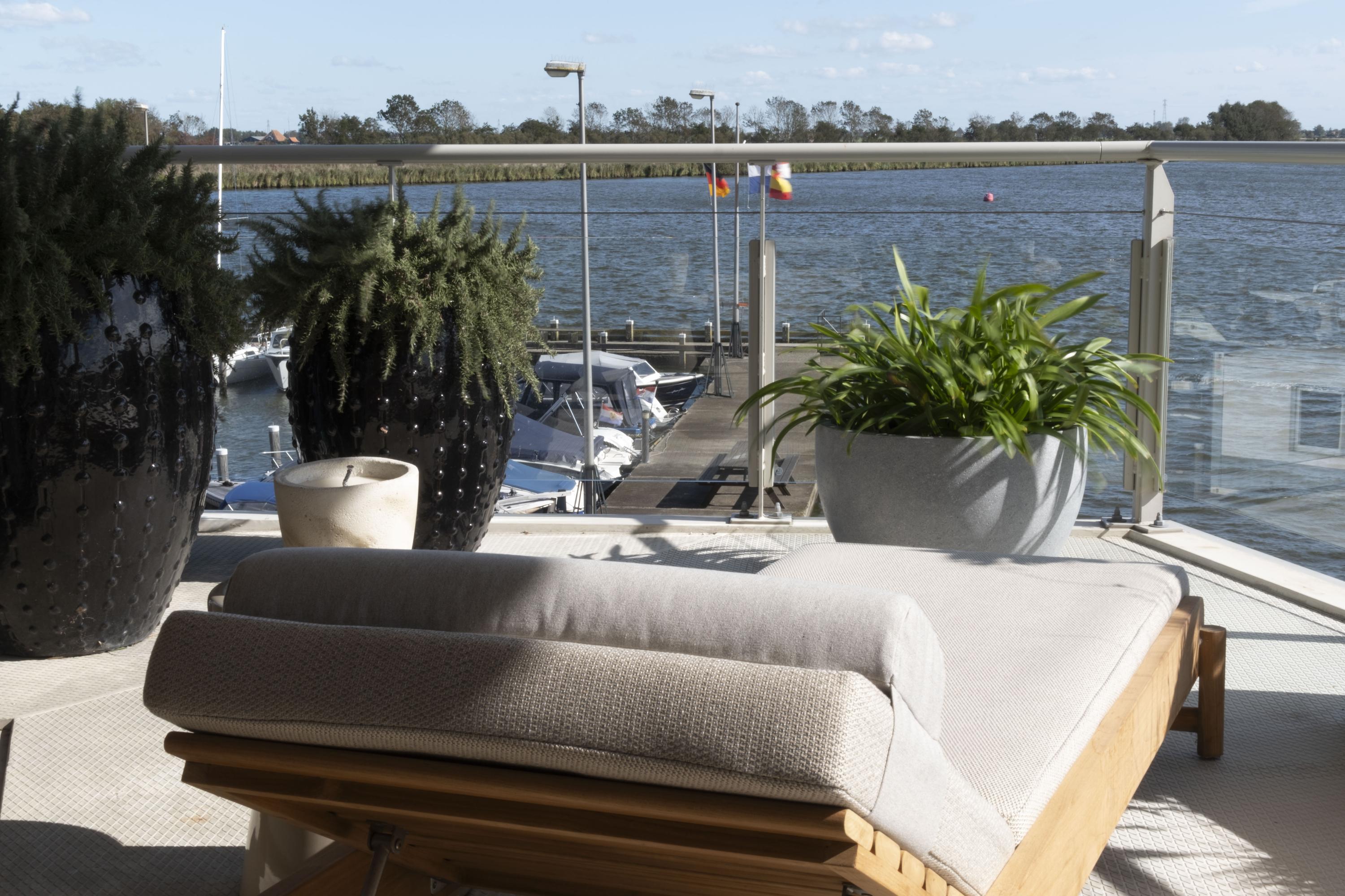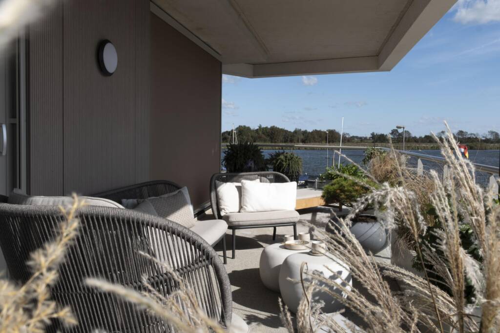 Door de brede schuifpui vloeit de woonkamer naadloos over in het balkon. Op zonnige dagen zet u de deuren open en wordt buiten een verlengstuk van binnen. Hier geniet u van de frisse lucht, het kabbelende water en het uitzicht dat nooit verveelt. Er is genoeg ruimte voor een comfortabele zithoek of een sfeervolle buitentafel.