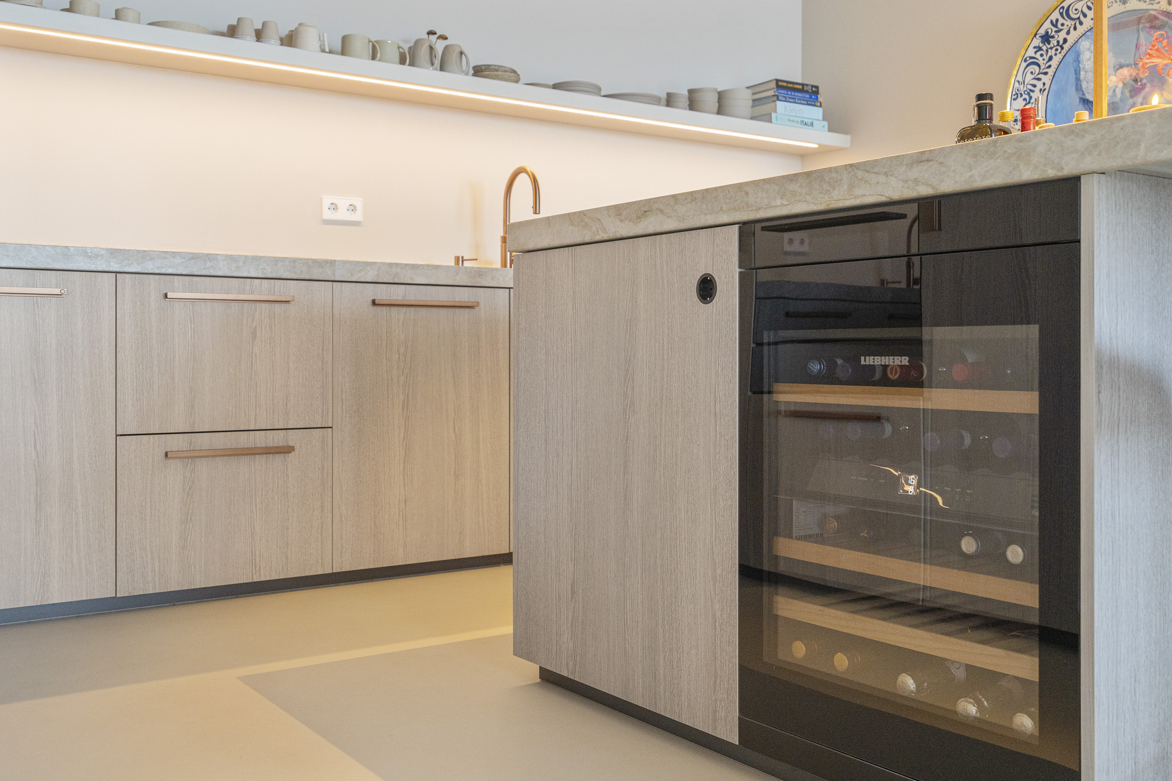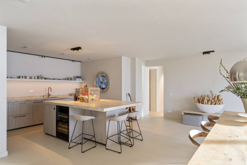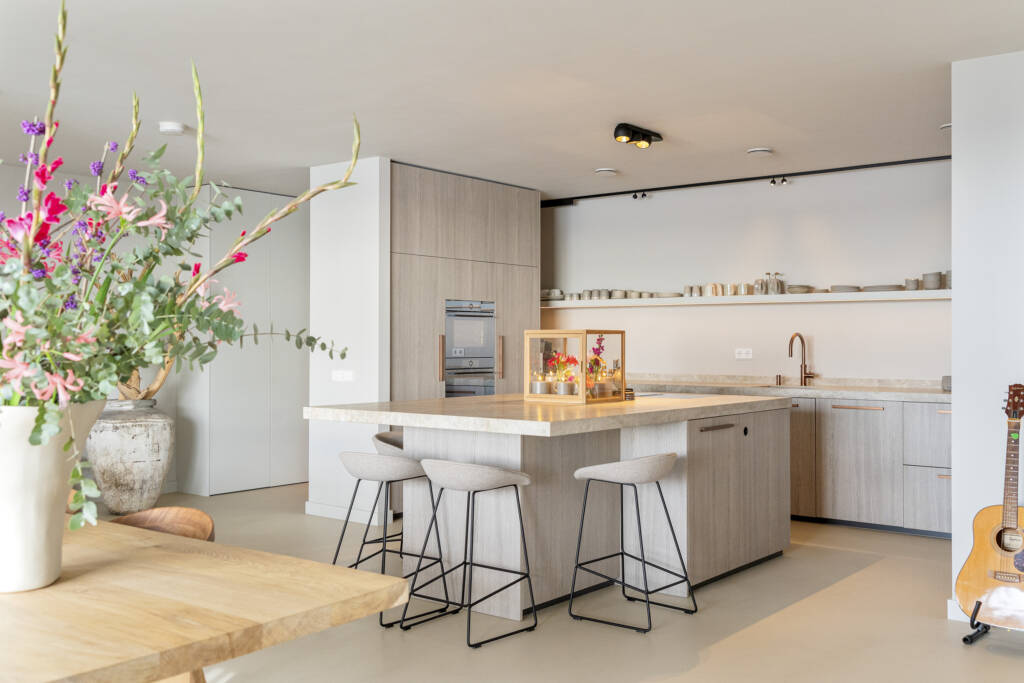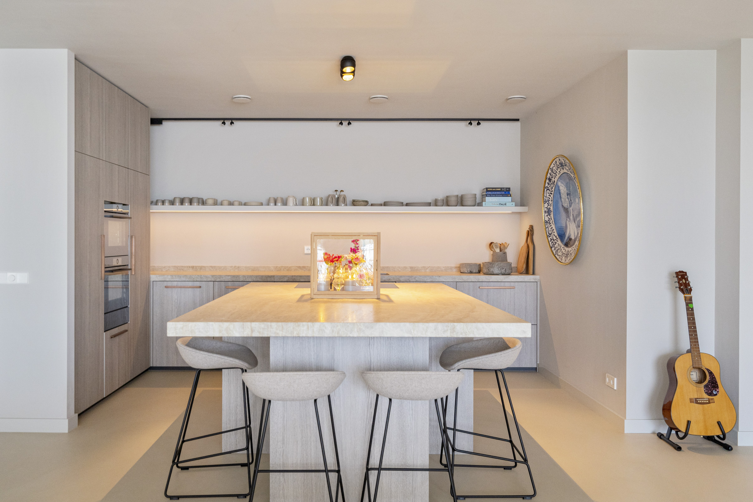 En dan de keuken… een absoluut pronkstuk in het hart van het appartement. Deze maatwerk keuken is niet alleen van uitzonderlijke kwaliteit, maar ook een lust voor het oog. Strak vormgegeven en volledig uitgerust met alles wat de veeleisende kookliefhebber zich maar kan wensen. Midden in de ruimte schittert het royale kookeiland met inductiekookplaat en geïntegreerde afzuiging. Hier kookt u met gemak een uitgebreid diner, terwijl uw gasten plaatsnemen aan de eetbar. Diezelfde bar wordt ’s ochtends de plek voor een eerste kop koffie, ’s middags voor een lunch en ’s avonds voor een goed glas wijn. Voor de wijnliefhebber is er natuurlijk een wijnklimaatkast, zodat elk glas precies op de juiste temperatuur geschonken kan worden.