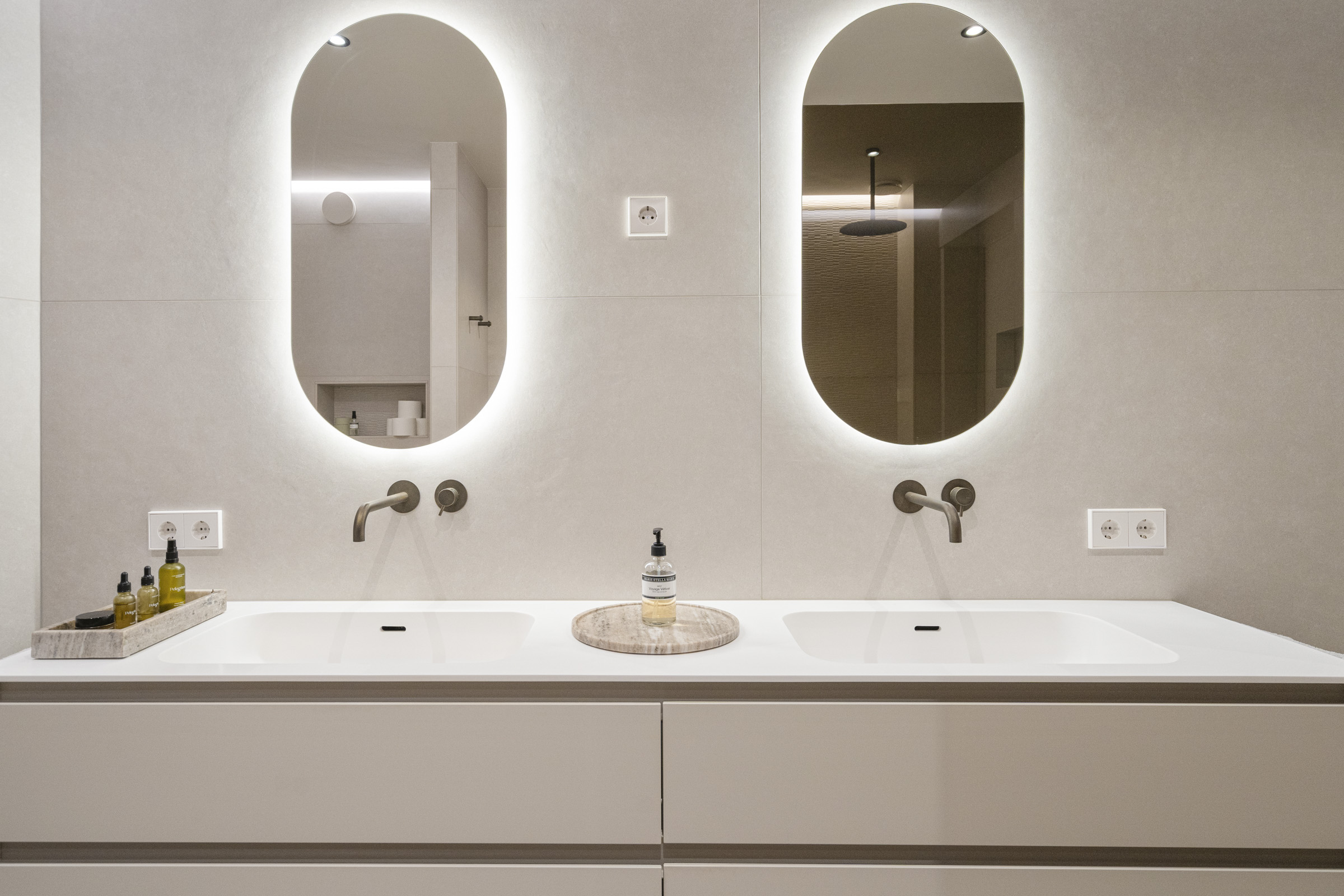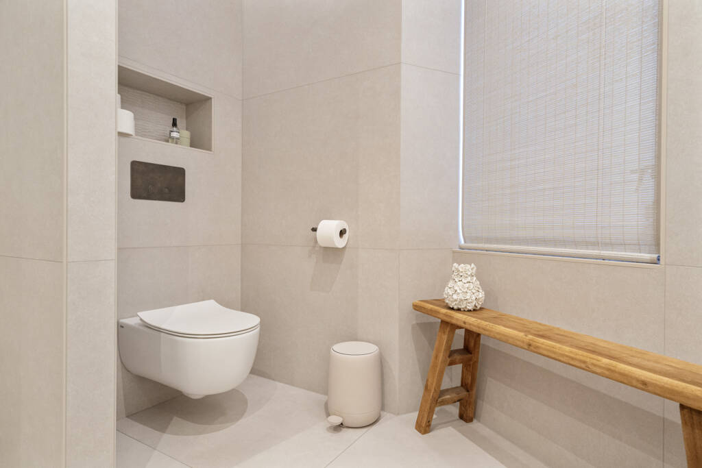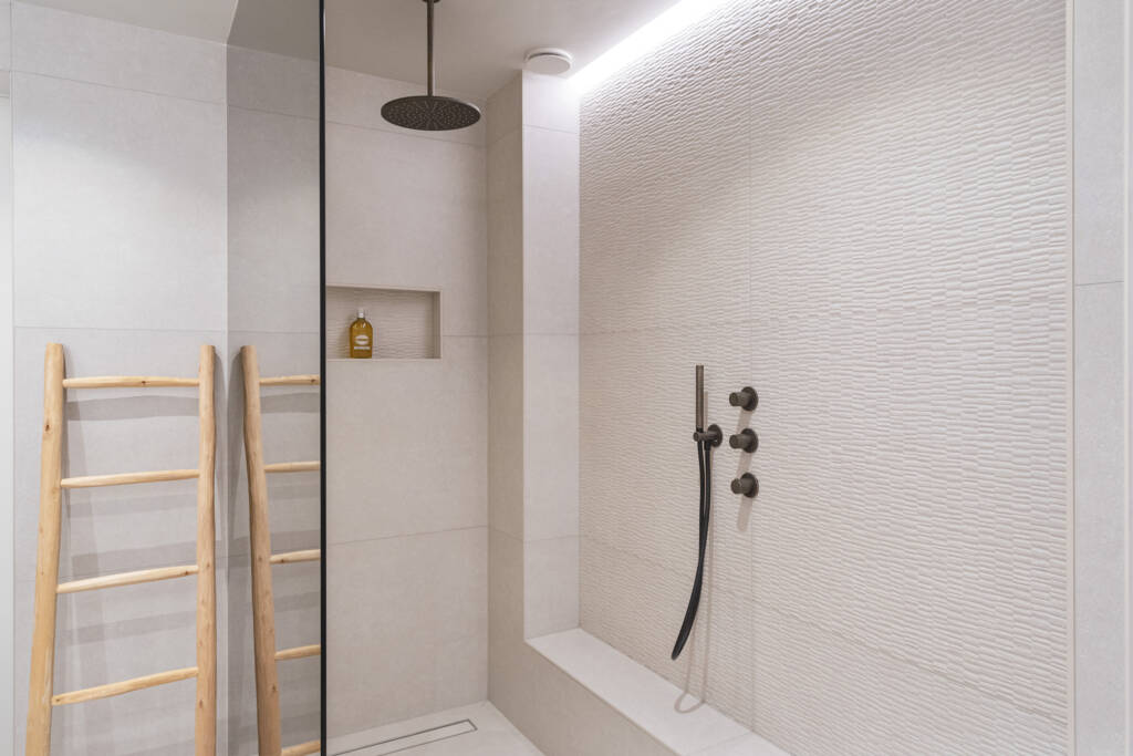 Deze moderne badkamer is stijlvol afgewerkt met grote grijze tegels en voorzien van vloerverwarming, wat zorgt voor een aangenaam gevoel van comfort. U heeft de keuze tussen een verfrissende douche met zowel een handdouche als een rainshower. De douche is subtiel afgescheiden van de rest van de badkamer door een rookglazen wand. Het wastafelmeubel beschikt over een dubbele wastafel met strak geïntegreerde kranen, terwijl ook in de douche de kranen elegant zijn weggewerkt. De spiegels zijn verwarmd en voorzien van touch free bediening, waardoor ze nooit beslaan en eenvoudig te bedienen zijn. Verder is de badkamer uitgerust met een tweede toilet, inbouwspots die zorgen voor sfeervolle verlichting en een mechanische afzuiging. Door de geplaatste Aquacell installatie in de meterkast beneden in de hal, zullen kranen, douchewand en ramen geen last meer hebben van kalkaanslag. Wat wilt u nog meer?