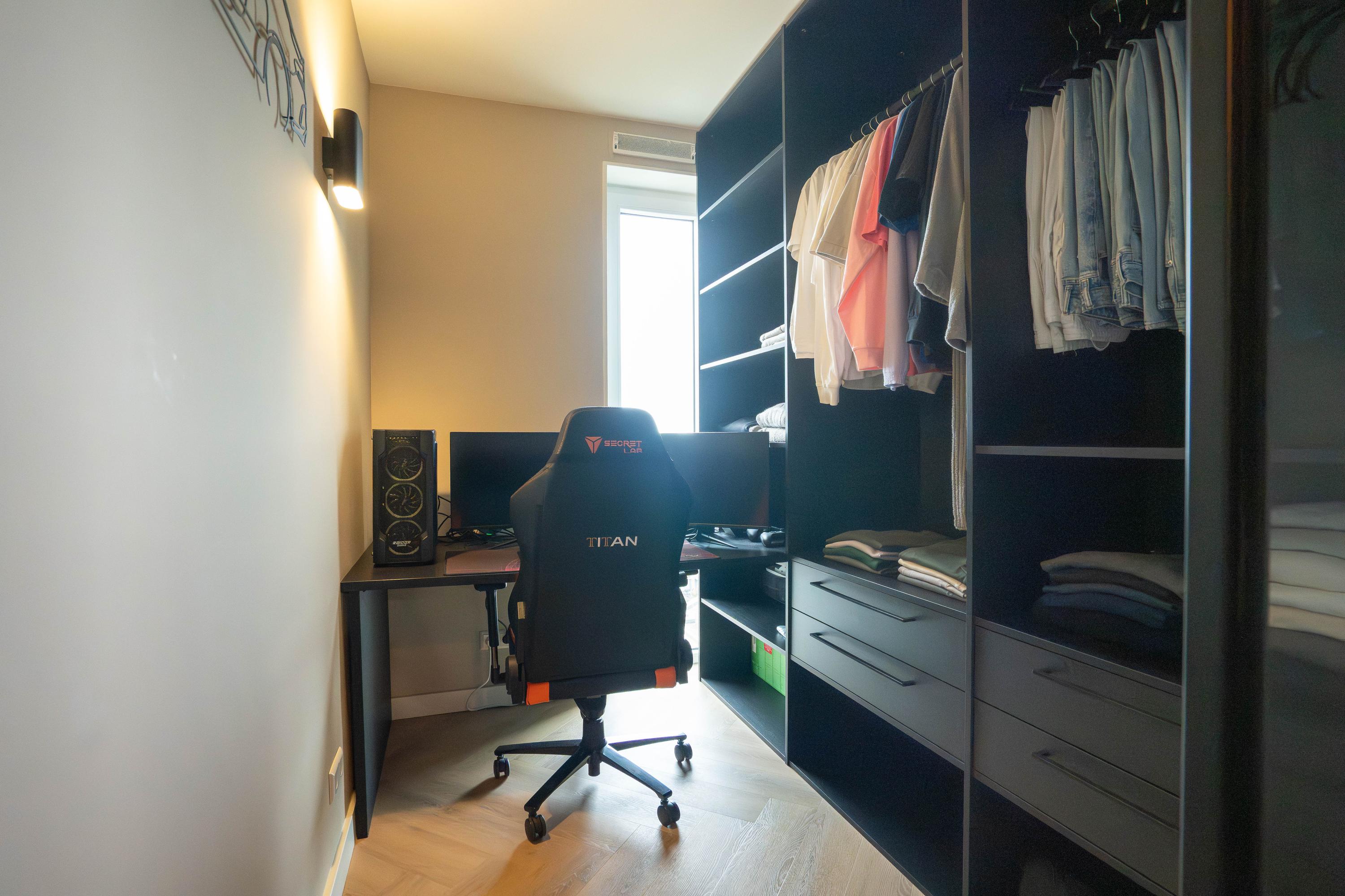 Verderop aan de achterzijde tref je de master bedroom, keurig afgewerkt en van goed formaat. Aangrenzend bevindt zich de werk- en/of kastenkamer, eveneens netjes en ruim opgezet met een raampartij van vloer tot plafond die zorgt voor een open en lichte sfeer. Beide kamers zijn voorzien van een stalen deur, wat het geheel een strakke en elegante uitstraling geeft.