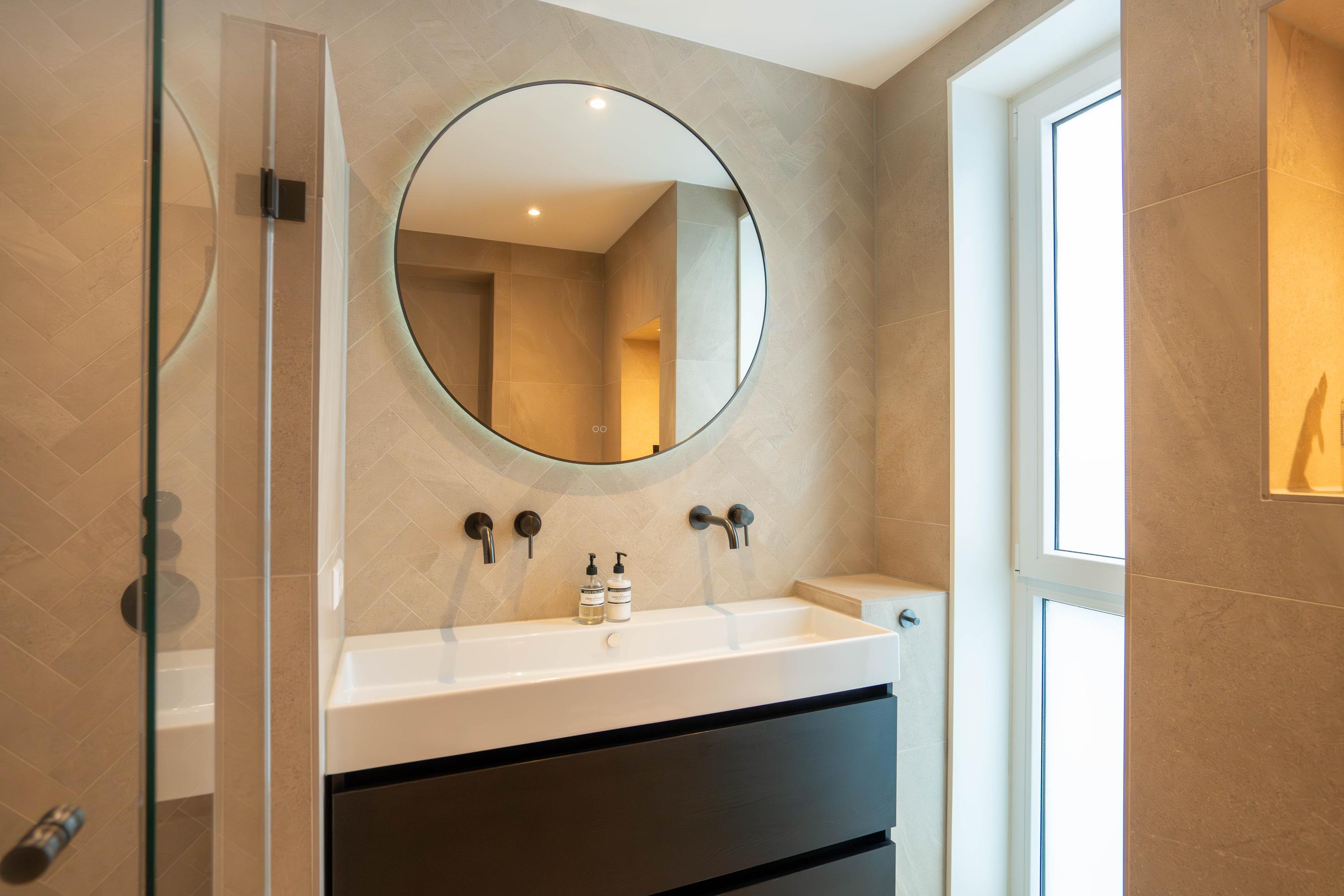 Daarnaast vind je de hoogwaardige badkamer, volledig afgewerkt met stijlvol tegelwerk. In de badkamer keren diverse gunmetal black accenten terug in de kranen en douchegarnituur, wat een moderne en luxe sfeer creëert. Hier staat een dubbel wastafelmeubel van geborsteld staal met een praktische ovale spiegel voorzien van verlichting en verwarming. De royale inloopdouche is uitgerust met zowel een stort- als handdouche en beschikt over een handige niche en een ingebouwde zitplaats. Verder is er in de badkamer een tweede toilet aanwezig.