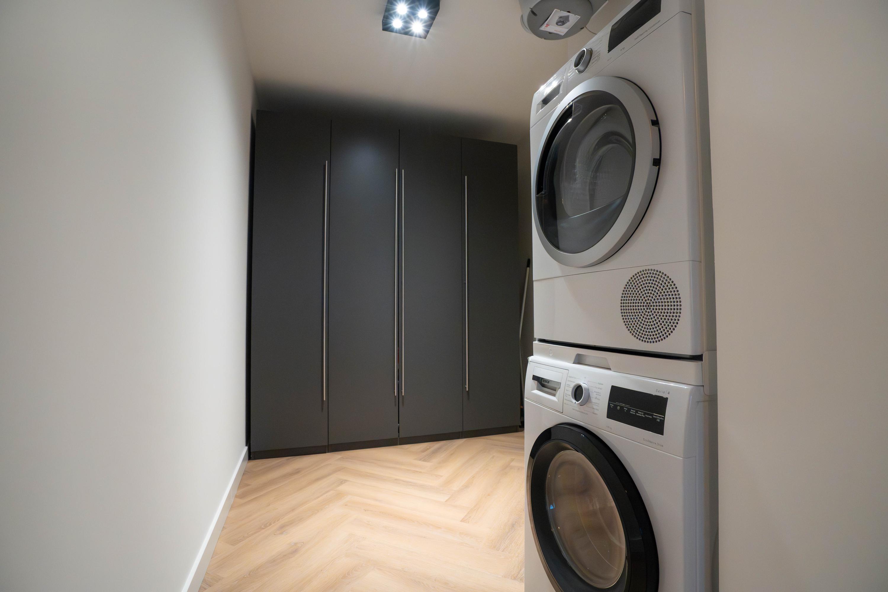 De open keuken is uitgevoerd met een modern schiereiland op een comfortabele werkhoogte van 96 cm en afgewerkt met een stijlvol composiet werkblad. Uiteraard is de keuken voorzien van hoogwaardige inbouwapparatuur, waaronder een Quooker, een inductiekookplaat met plasma-afzuiging, een combimagnetron, een koel-vriescombinatie en een vaatwasser op hoogte voor optimaal gebruiksgemak. Bovendien bevindt zich naast de keuken de videophone.