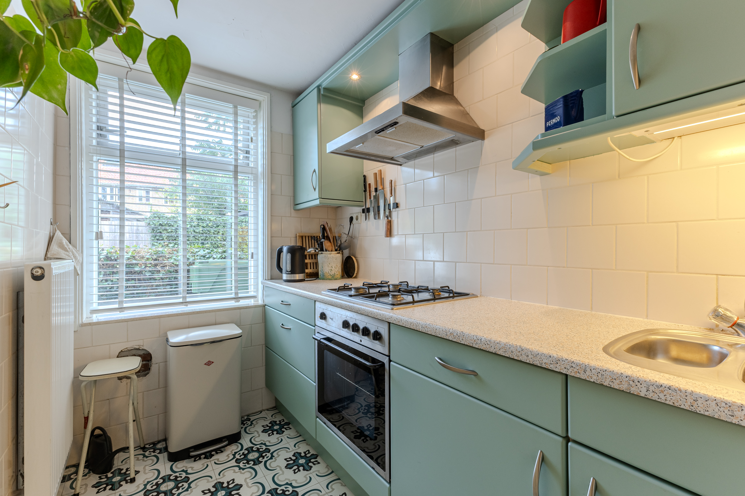 Via de trap komen we op de begane grond. In de entree heeft u toegang tot het 1e toilet en de keuken. Let op de Portugese tegeltjes, die geven de ruimte meteen karakter. De keuken biedt volop werkruimte om lekker te kokkerellen en heeft voldoende kasten en lades om alles netjes op te bergen. Aan inbouwapparatuur geen gebrek: een 4-pits gaskookplaat, afzuigkap, oven en spoelbak zijn aanwezig.