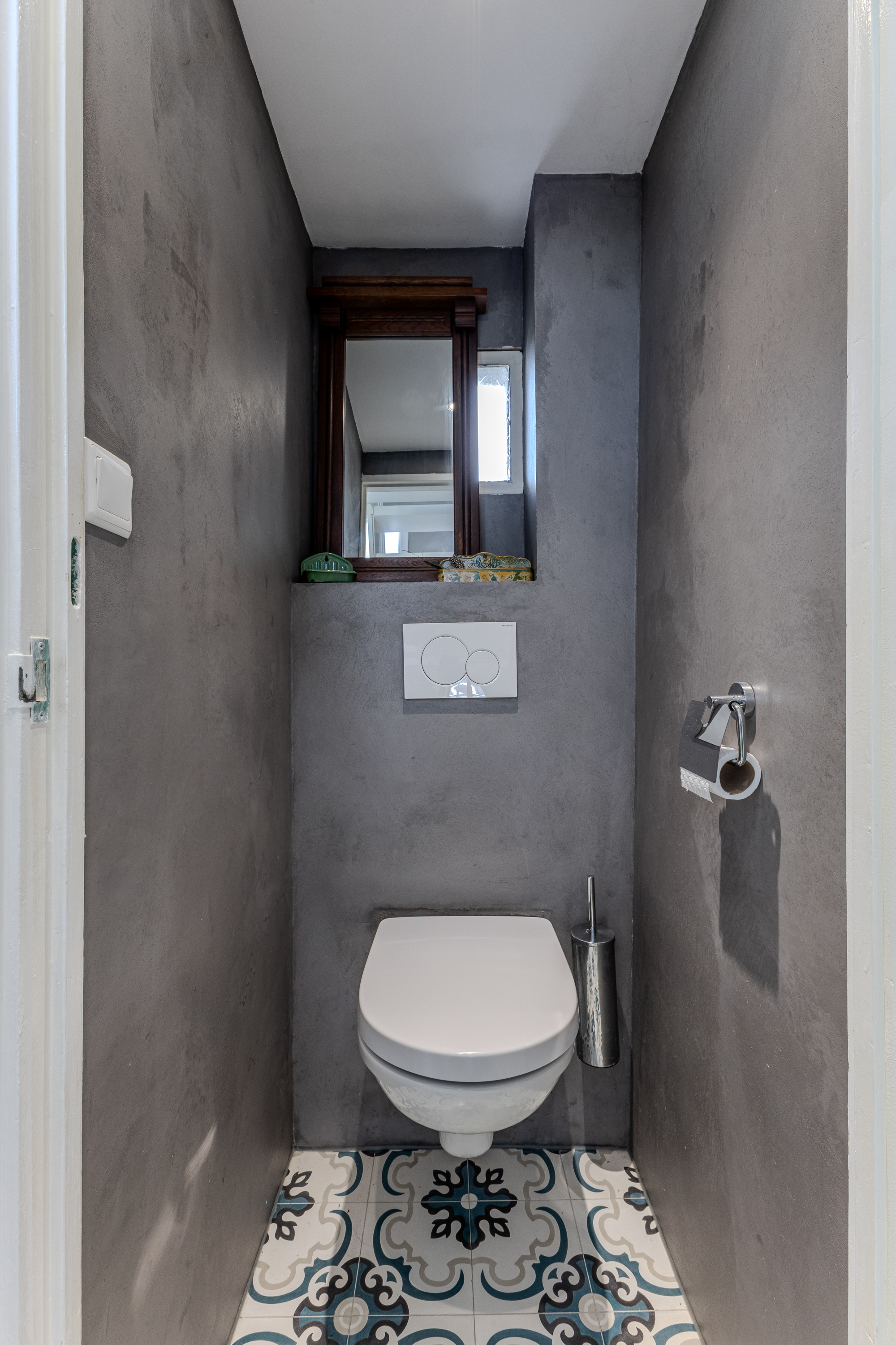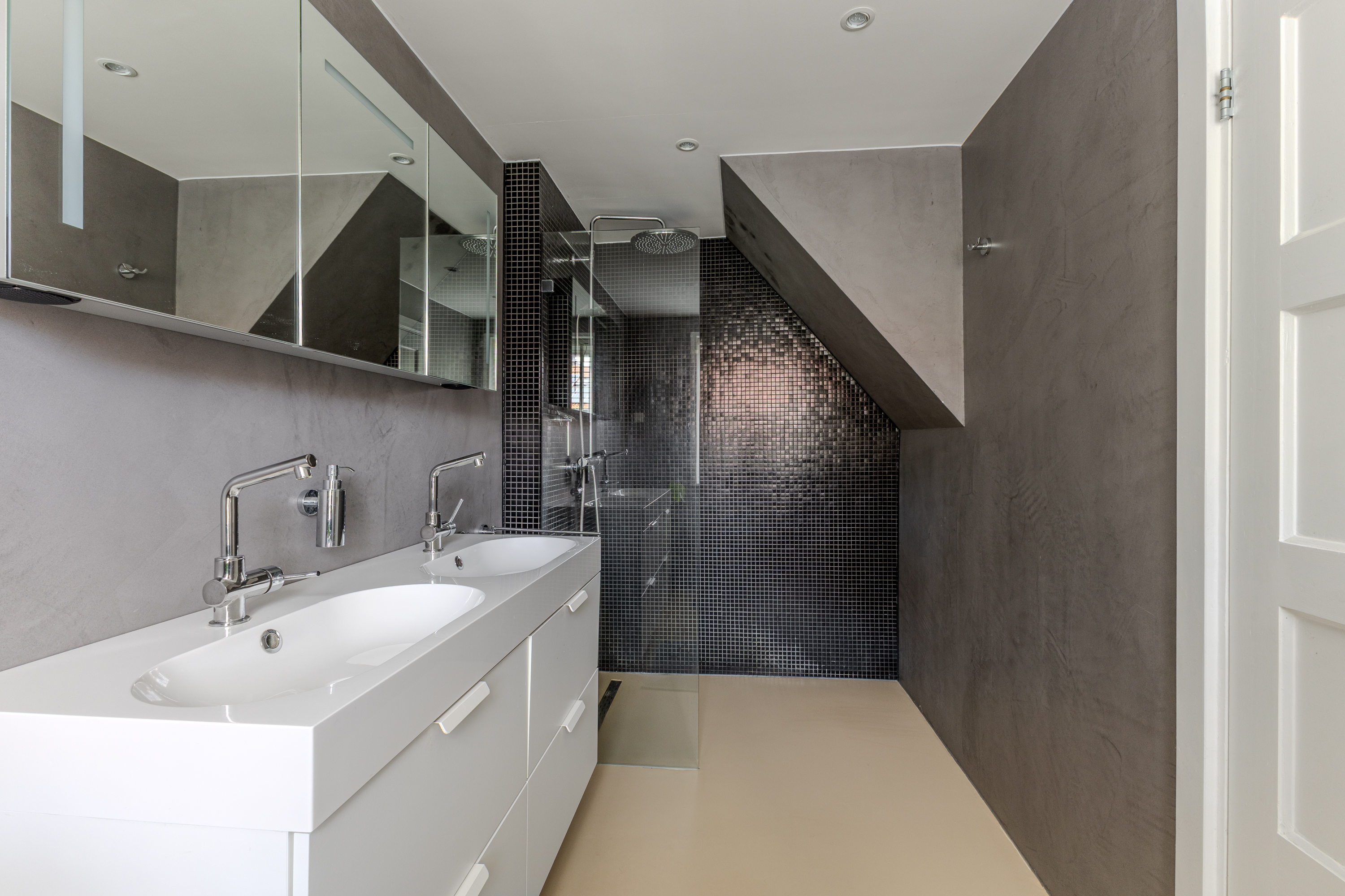 Op de laag daarboven vindt u de wasruimte met plek voor wasmachine en droger, én de badkamer. Stoer afgewerkt met een gietvloer en betonlook wanden. Ook hier vloerverwarming – dus warme voeten gegarandeerd. De badkamer is uitgerust met een 2e toilet, een douche met zowel hand- als stortdouche, en een stijlvol wastafelmeubel met dubbele kraan. De verwarmde spiegelkast voorkomt beslagen spiegels, en dankzij de ingebouwde speakers kunt u via USB uw favoriete muziek afspelen – heerlijk ontspannen douchen met een soundtrack naar keuze.