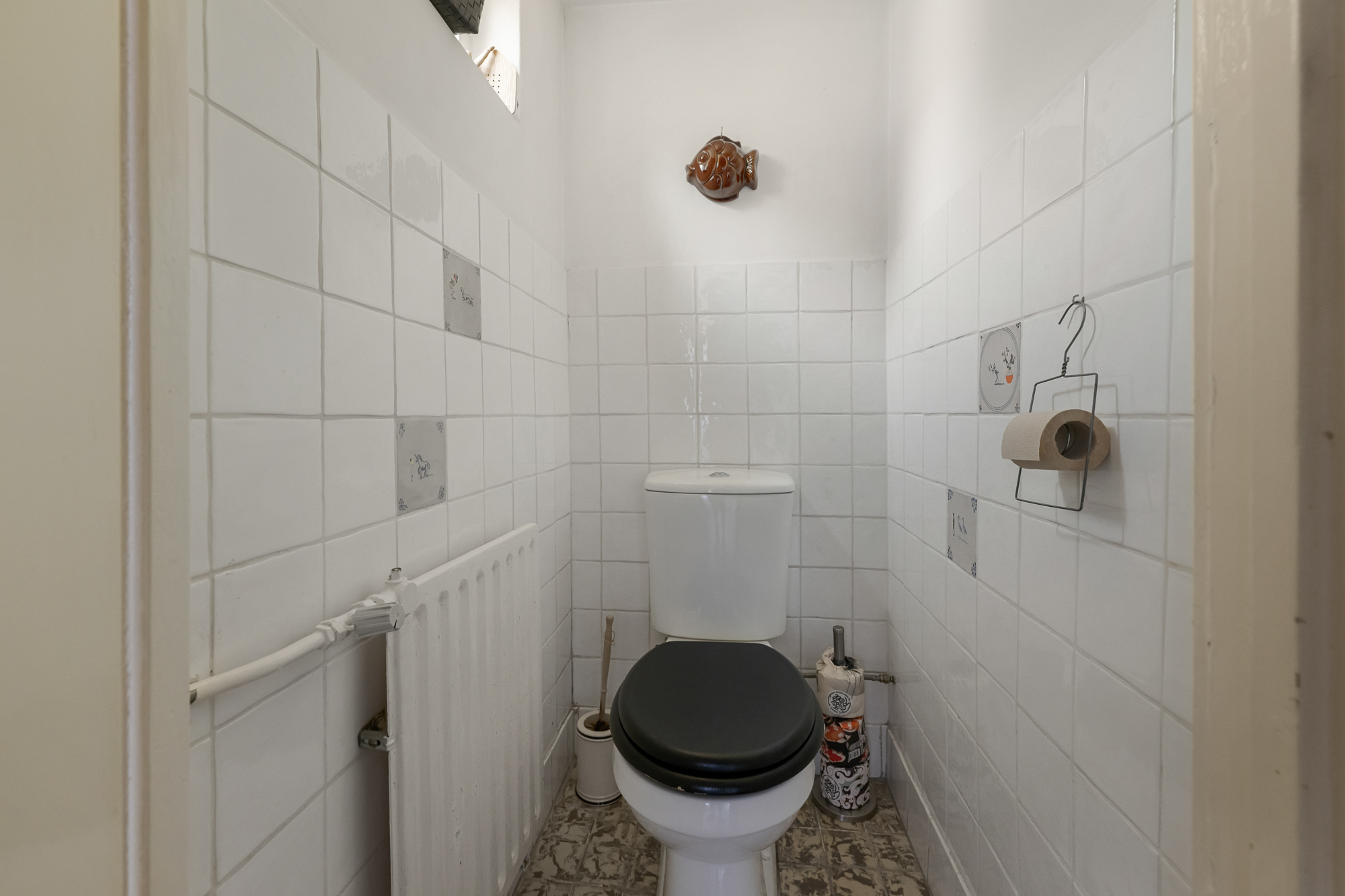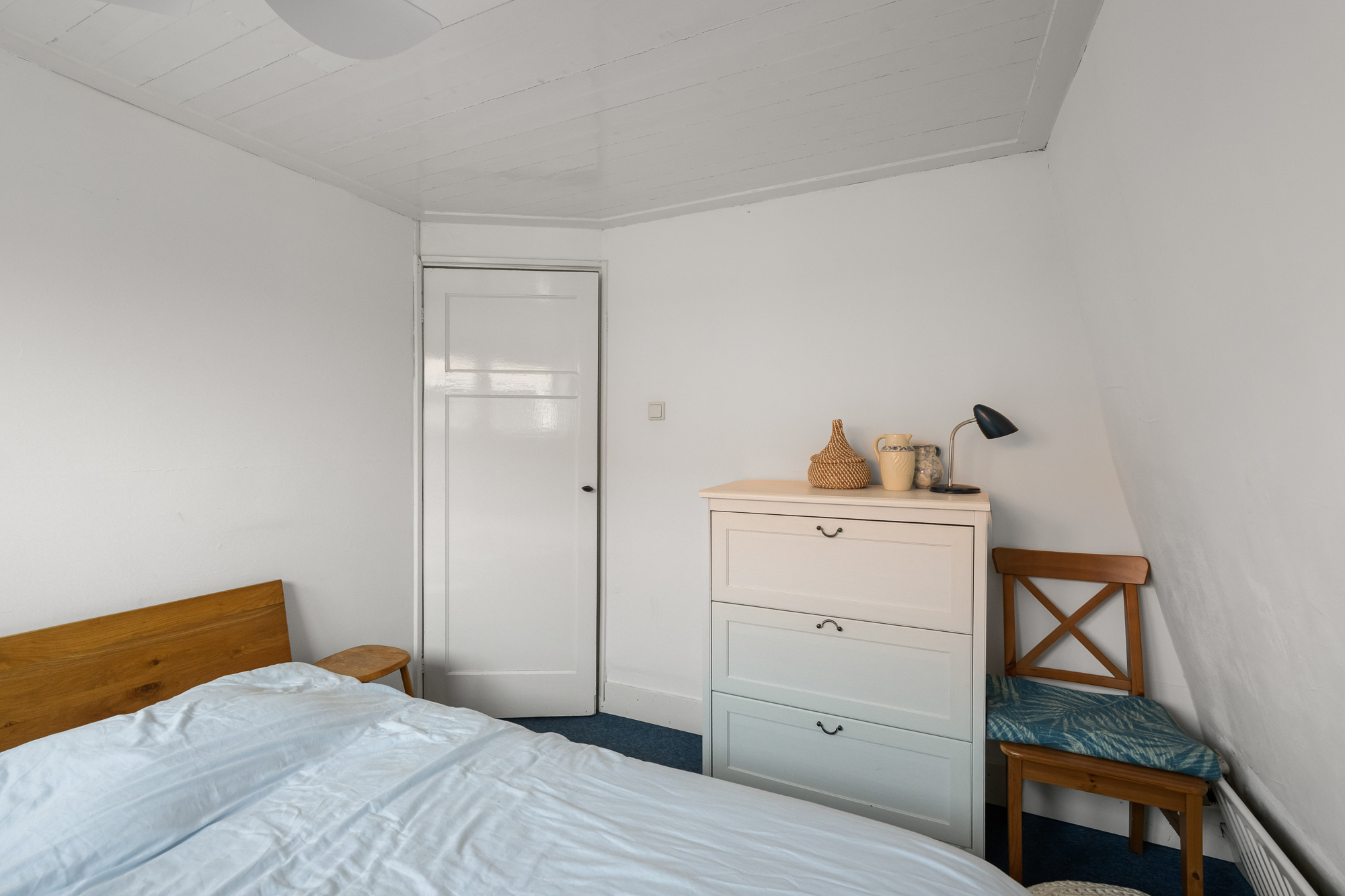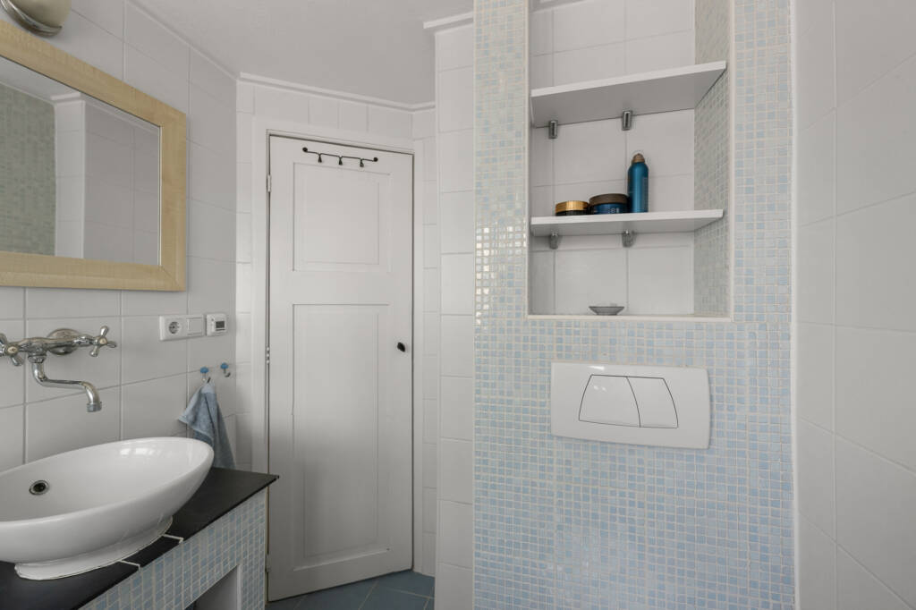 De badkamer heeft door de blauwe tegels een frisse, levendige uitstraling en is praktisch ingedeeld met een royale inloopdouche, tweede toilet en wastafelmeubel. Vloerverwarming zorgt hier voor extra comfort en dankzij de dakkapel geniet u van natuurlijk daglicht en ventilatie.