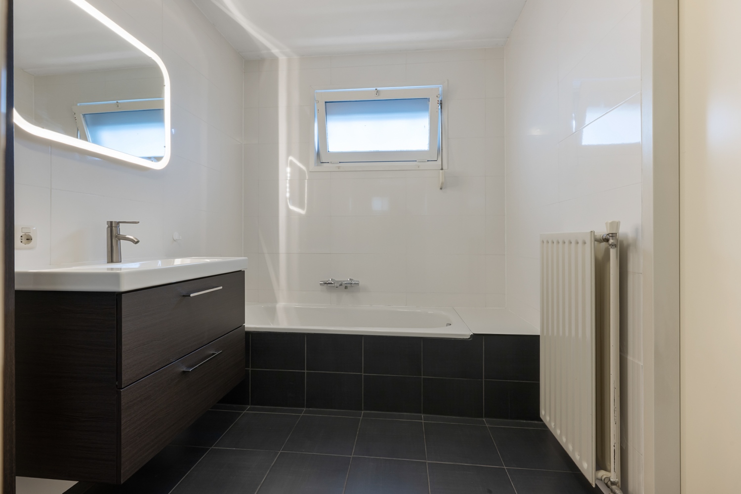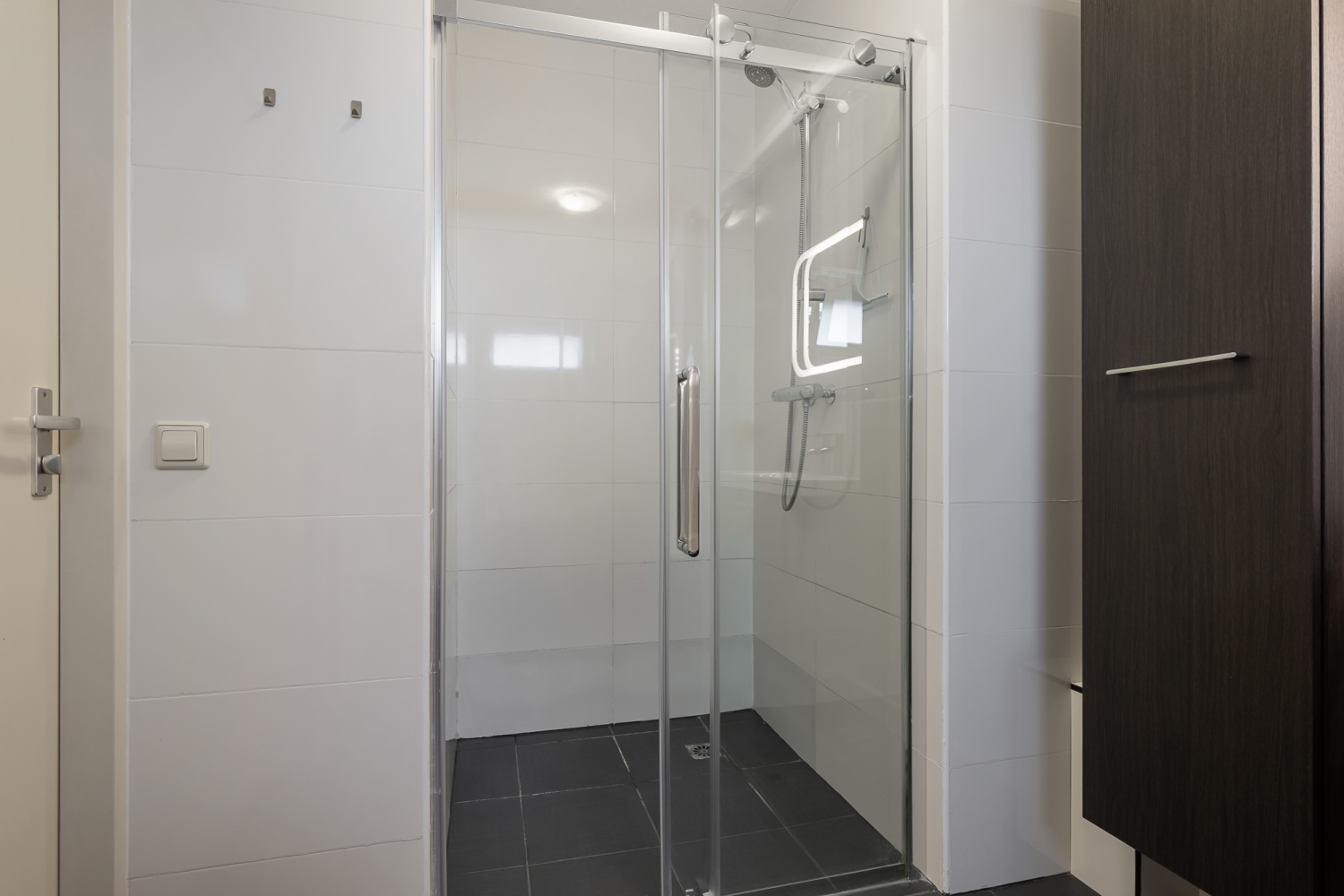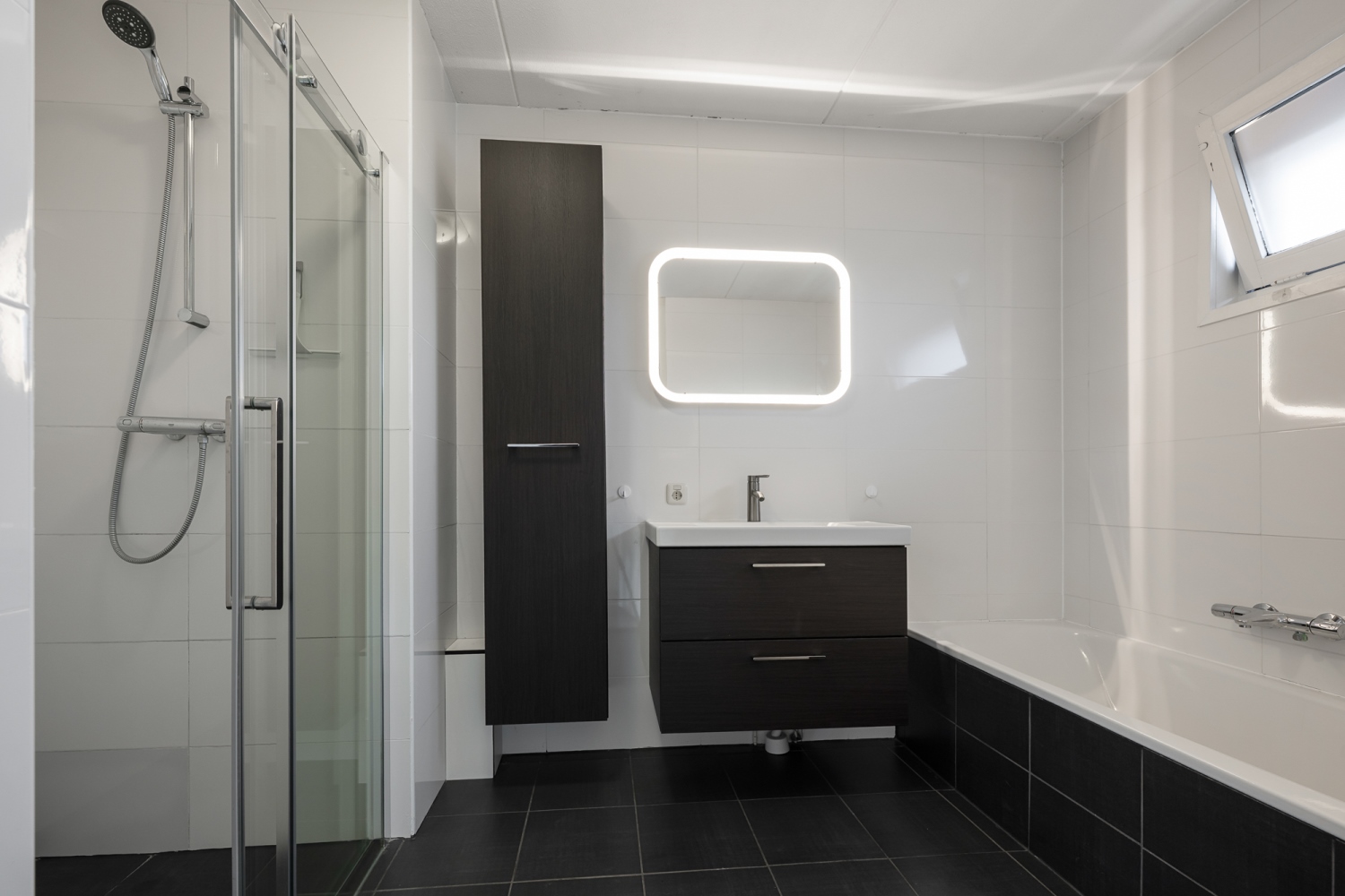 De ruime badkamer is uitgerust met een ligbad, een douche en een wastafelmeubel. Daarnaast is er een separaat toilet aanwezig.