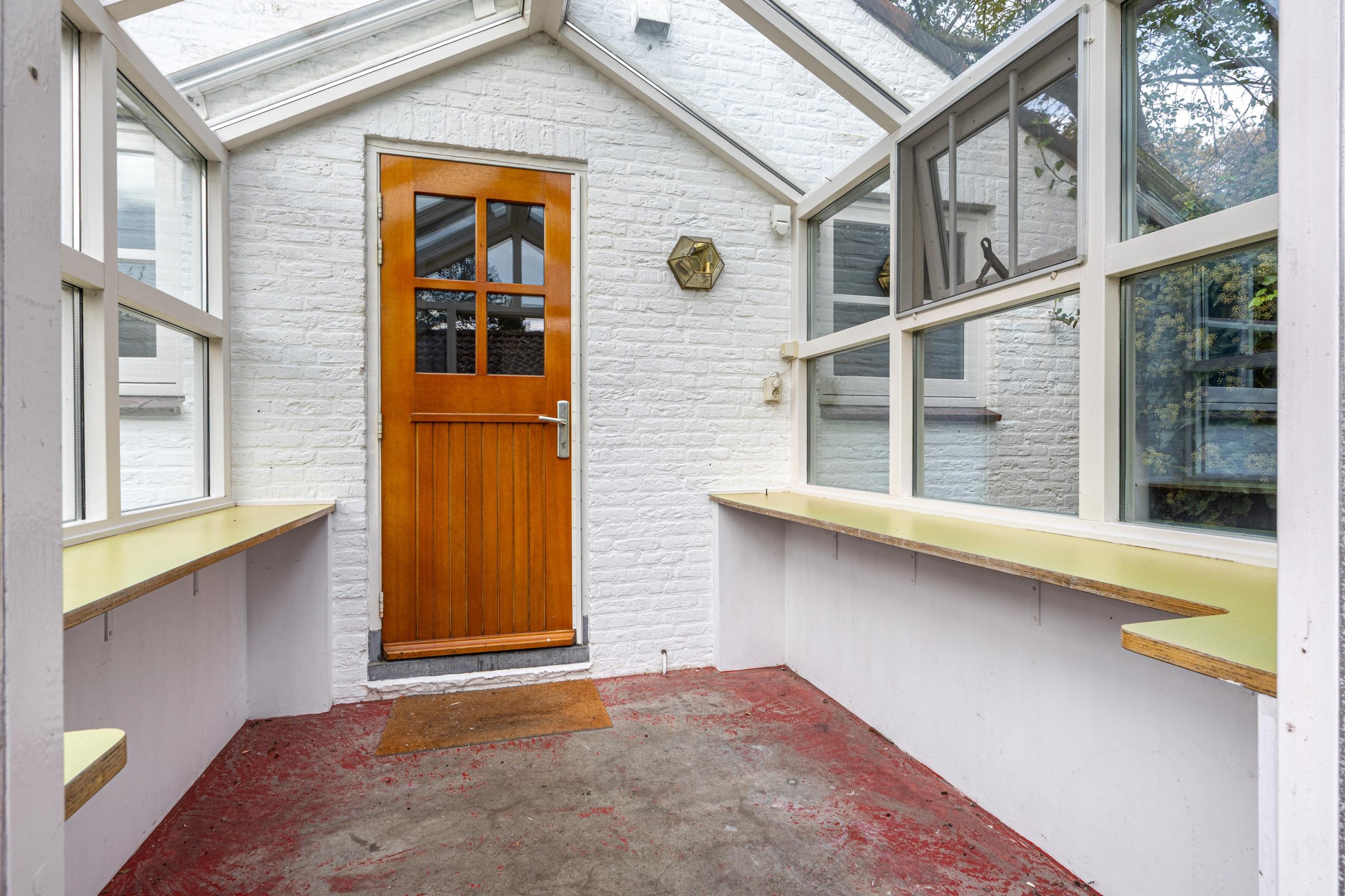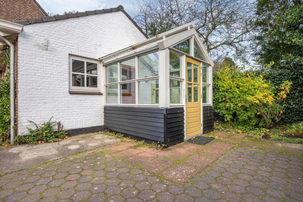 Een glazen/stenen “Engelse” kas verbindt de bijkeuken met de tuin en leent zich prima voor bijvoorbeeld planten en laarzen.