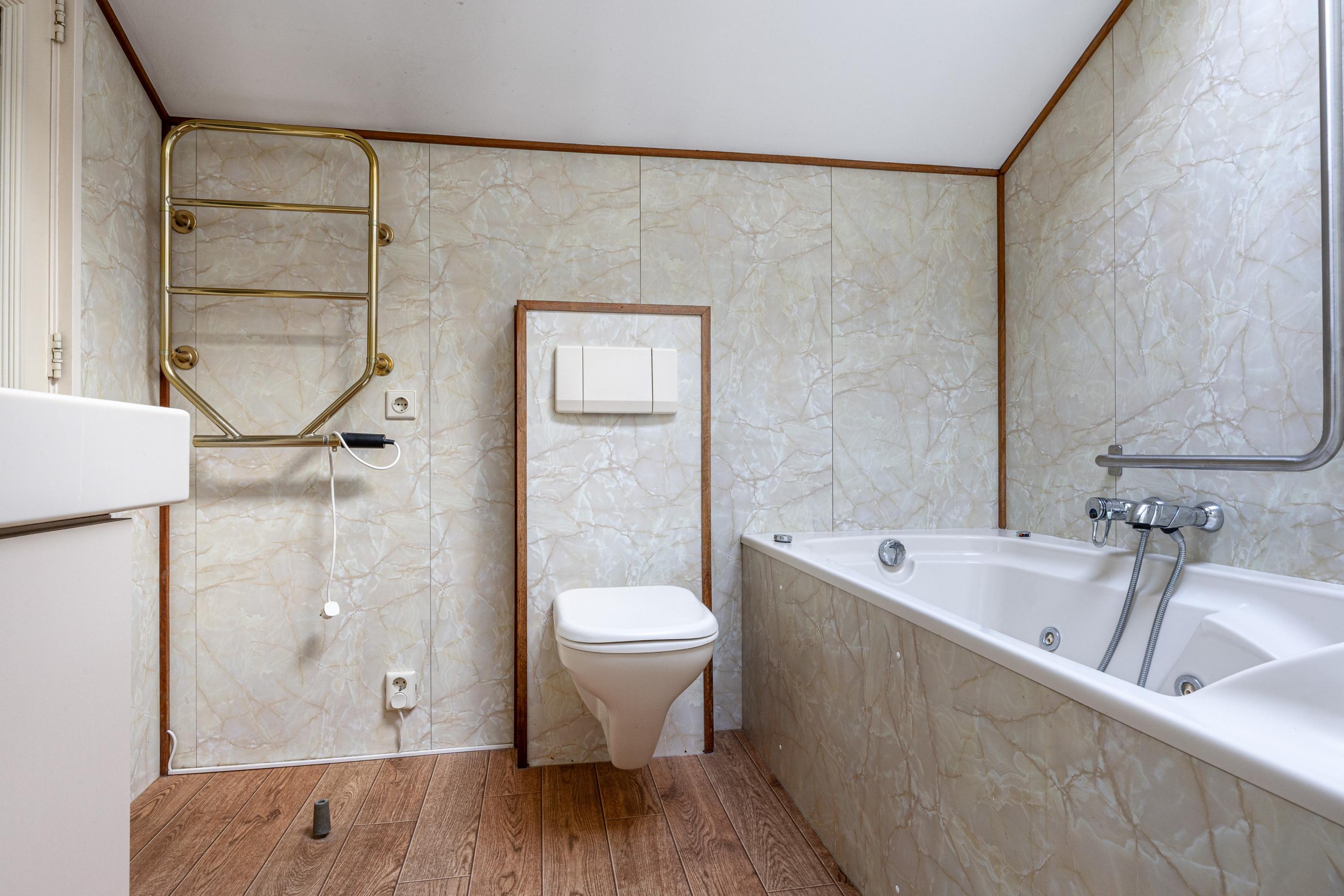 Op de begane grond bevindt zich tevens een royale slaapkamer. Vanuit deze kamer is er directe toegang tot de badkamer, die voorzien is van een bad, douchecabine, toilet, wastafel en een dakraam dat zorgt voor natuurlijk licht.