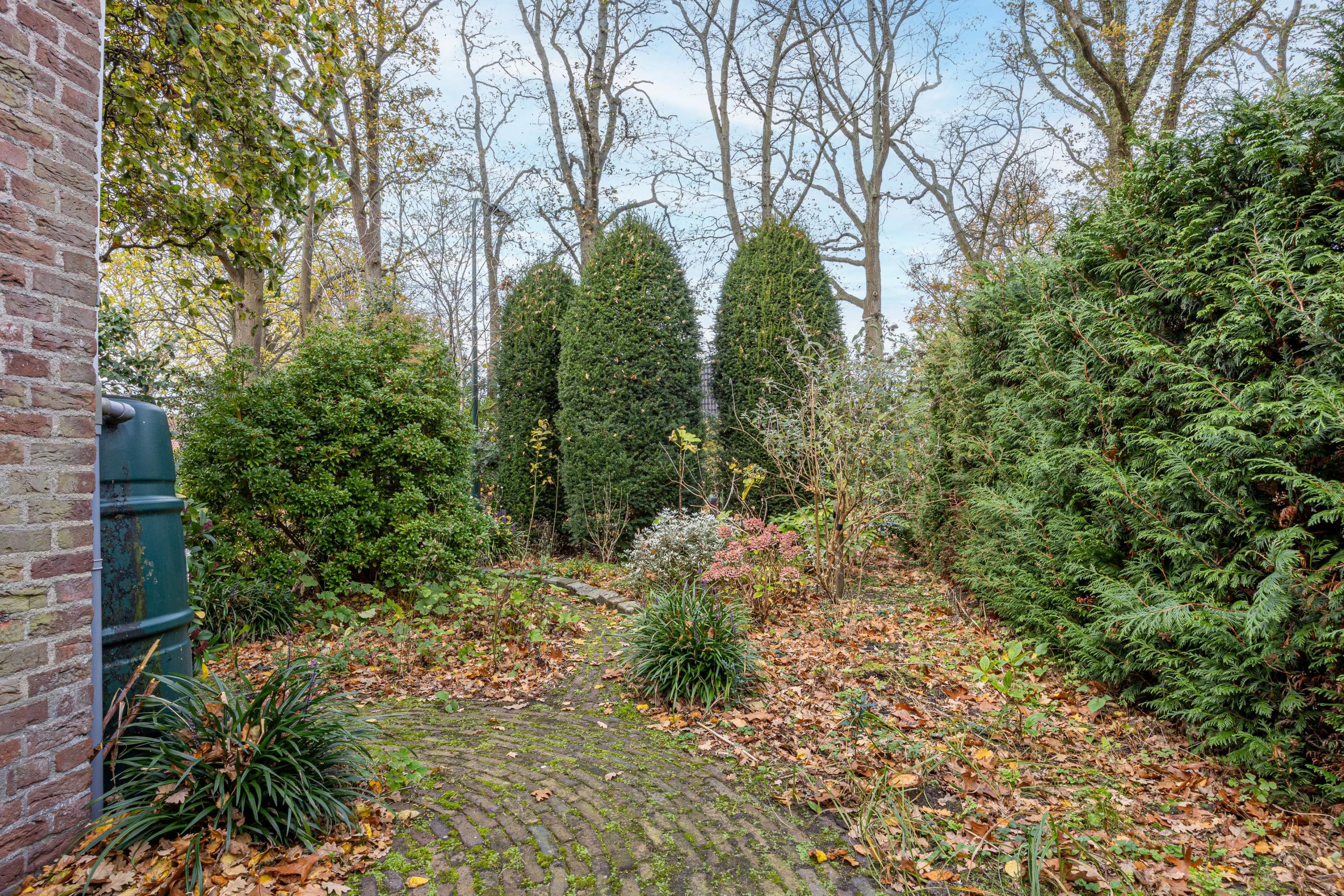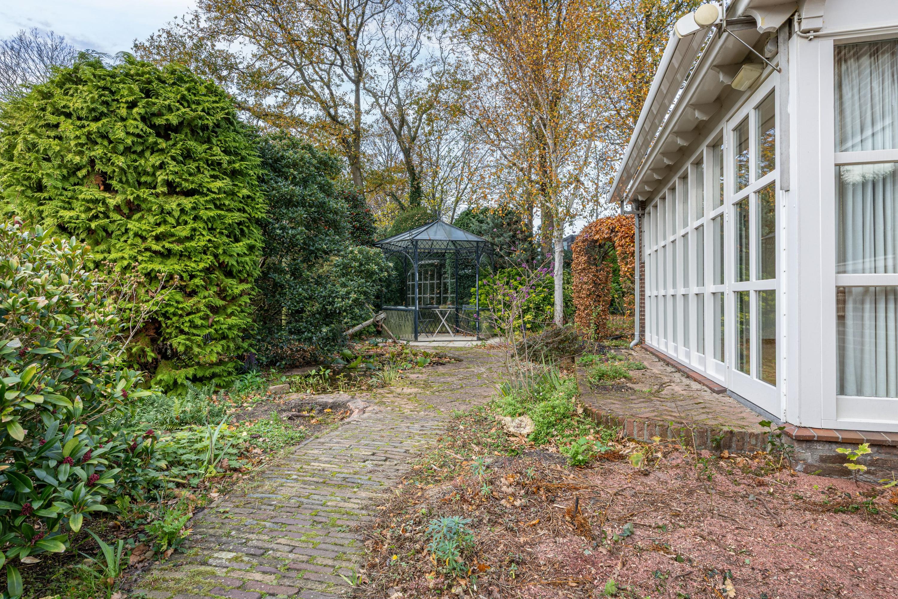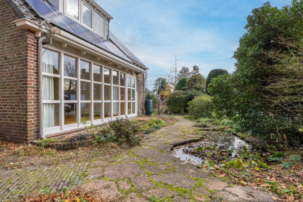De tuin rondom de woning is een klein paradijs. Vijvers, planten, struiken en volwassen bomen zorgen voor een levendig geheel dat elk seizoen een ander aanzicht biedt. Er is altijd wel een plekje in de zon te vinden dankzij de gunstige zuidgeoriënteerde tuin of juist een schaduwrijke hoek om even te ontsnappen aan de warmte. Voor in de tuin staat een charmant prieel, perfect voor lange zomeravonden.
