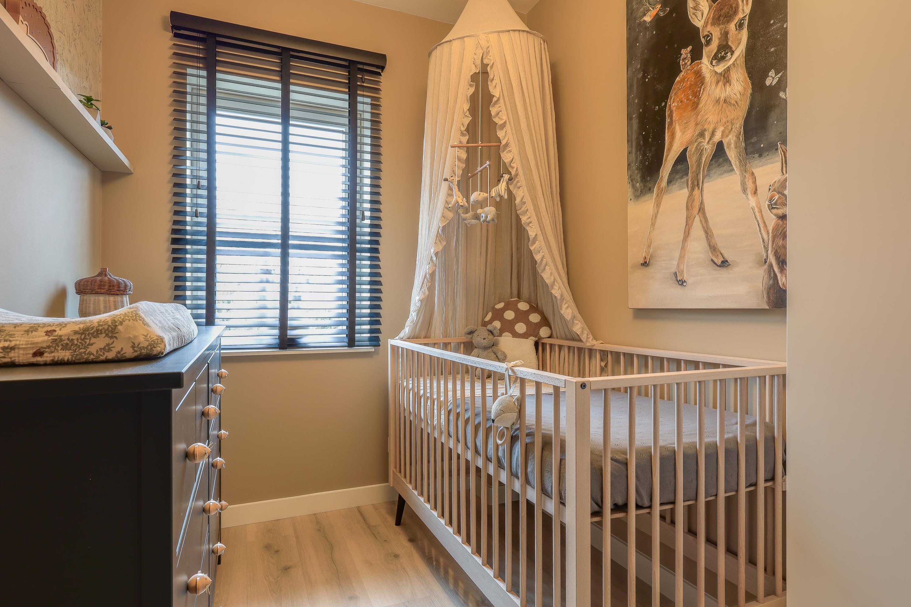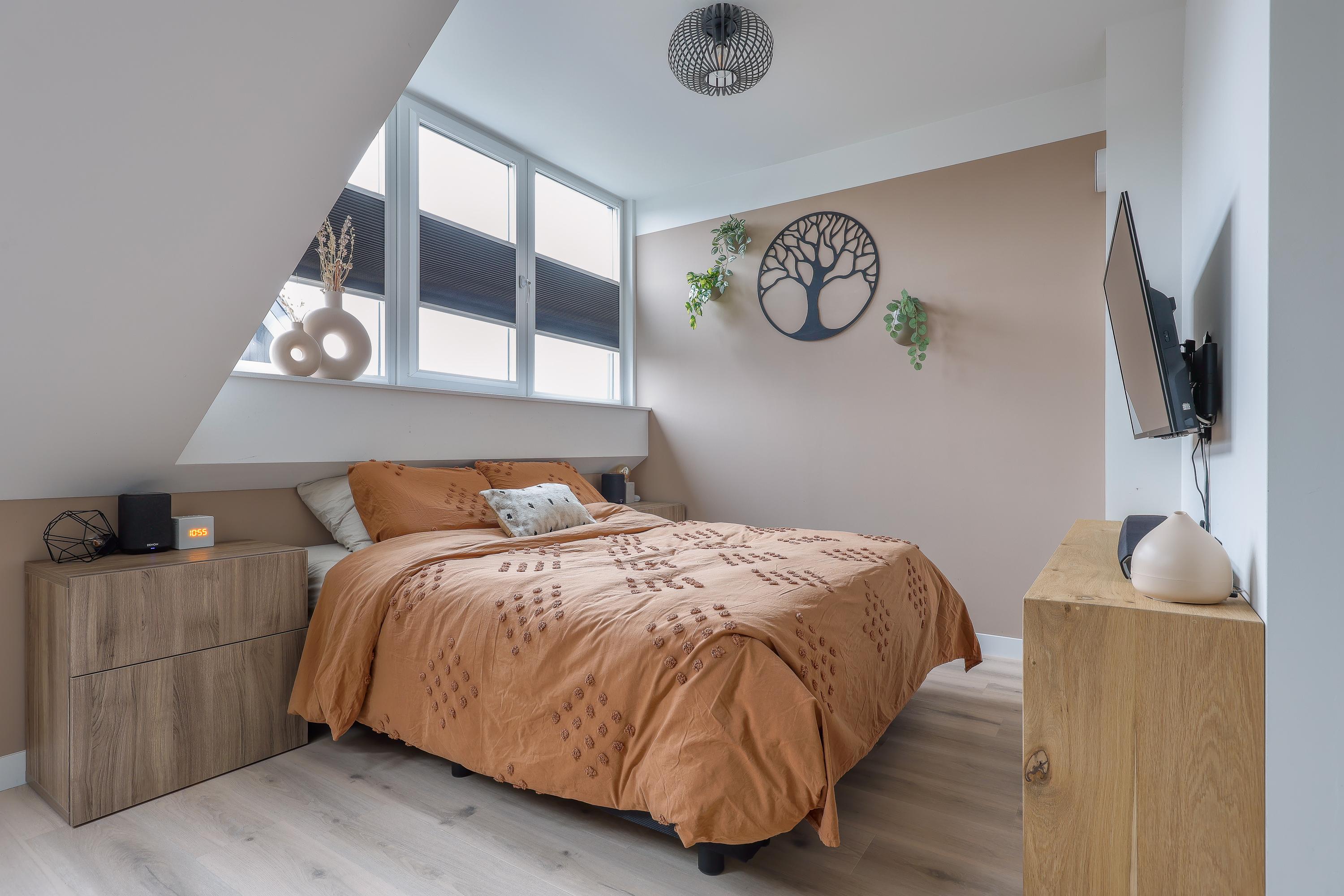 Op de eerste verdieping treft u twee comfortabele slaapkamers, beide met dezelfde moderne afwerking als beneden. De hoofdslaapkamer aan de achterzijde biedt volop ruimte en sfeer, terwijl de slaapkamer aan de voorzijde ideaal in te delen is als kinder- of werkkamer.