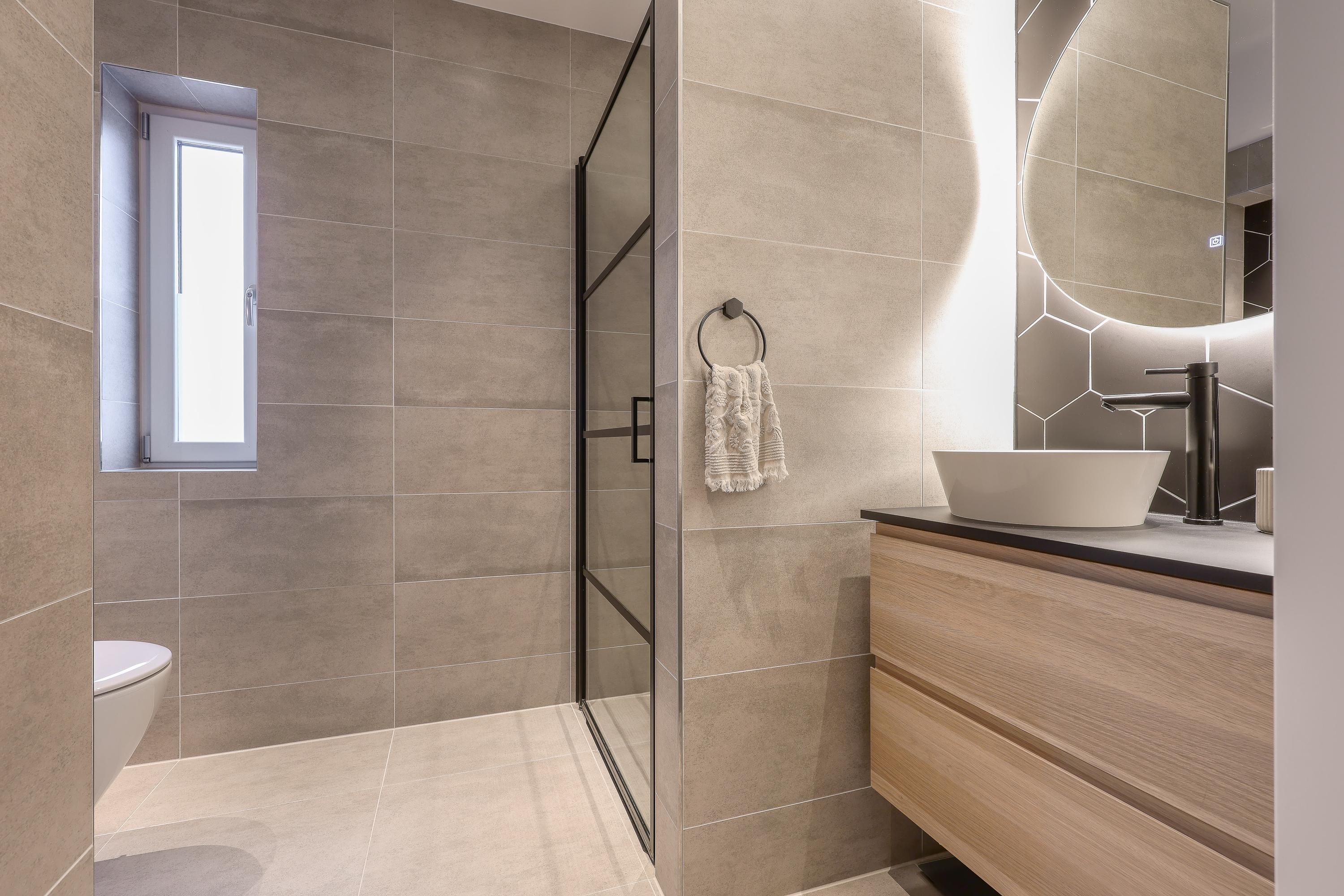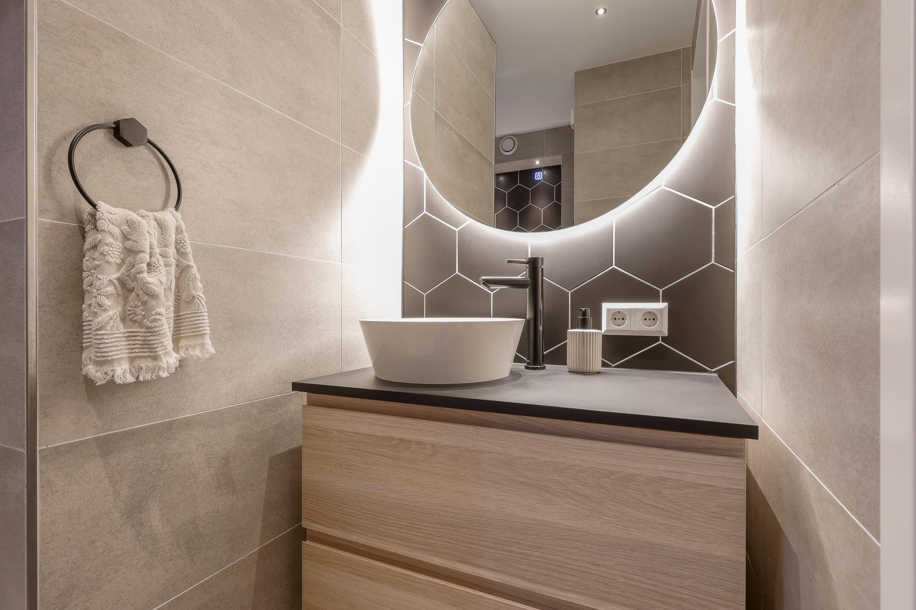De badkamer is een luxe oase, compleet met een inloopdouche voorzien van stort- en handdouche, nisjes, een drain, een stijlvolle wastafel met waskom, een tweede toilet en inbouwspots. De mix van tegels geeft de ruimte een moderne uitstraling.