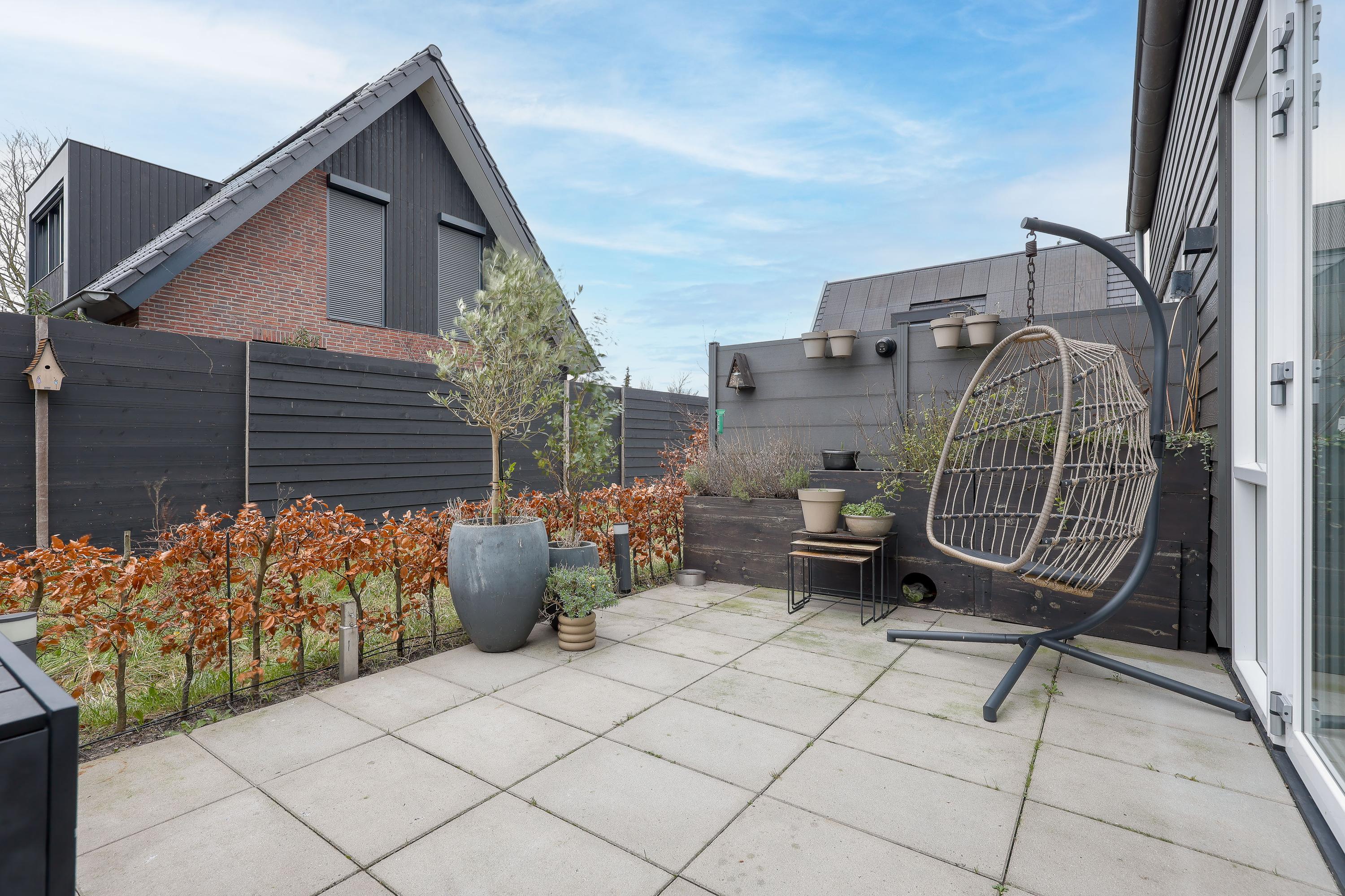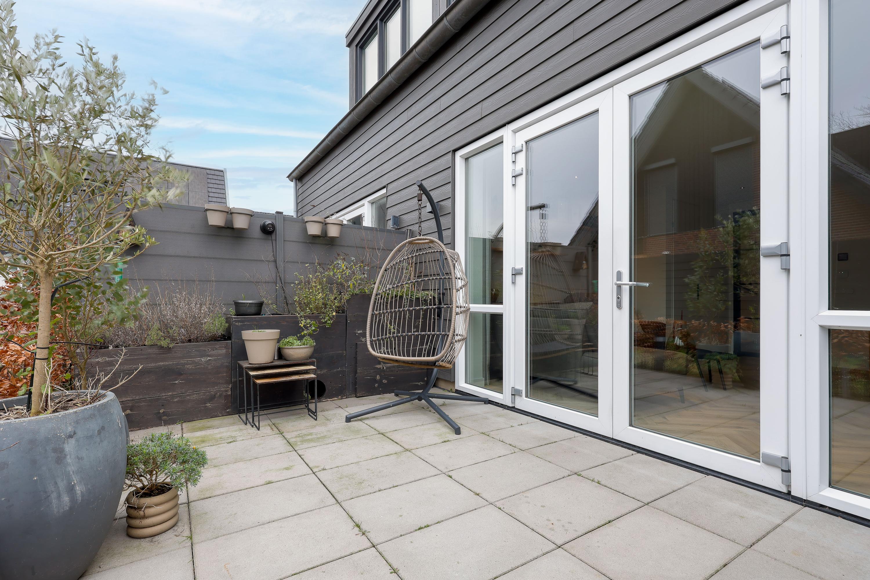 De lichte woonkamer is een heerlijke plek om te ontspannen. Via openslaande kunststof tuindeuren stapt u zo de onderhoudsvriendelijke terras op. Extra opbergruimte is te vinden in de praktische trapkast.