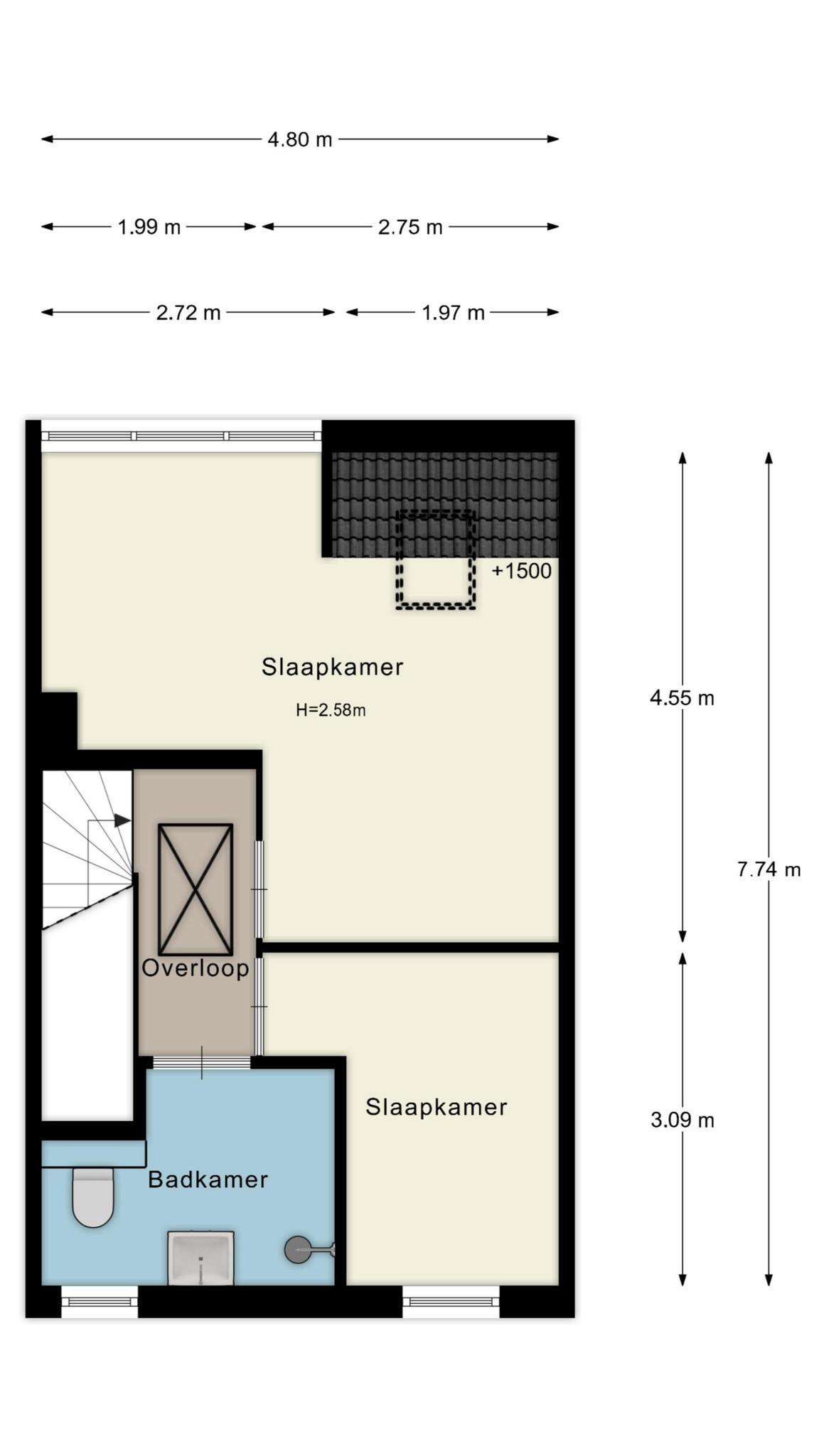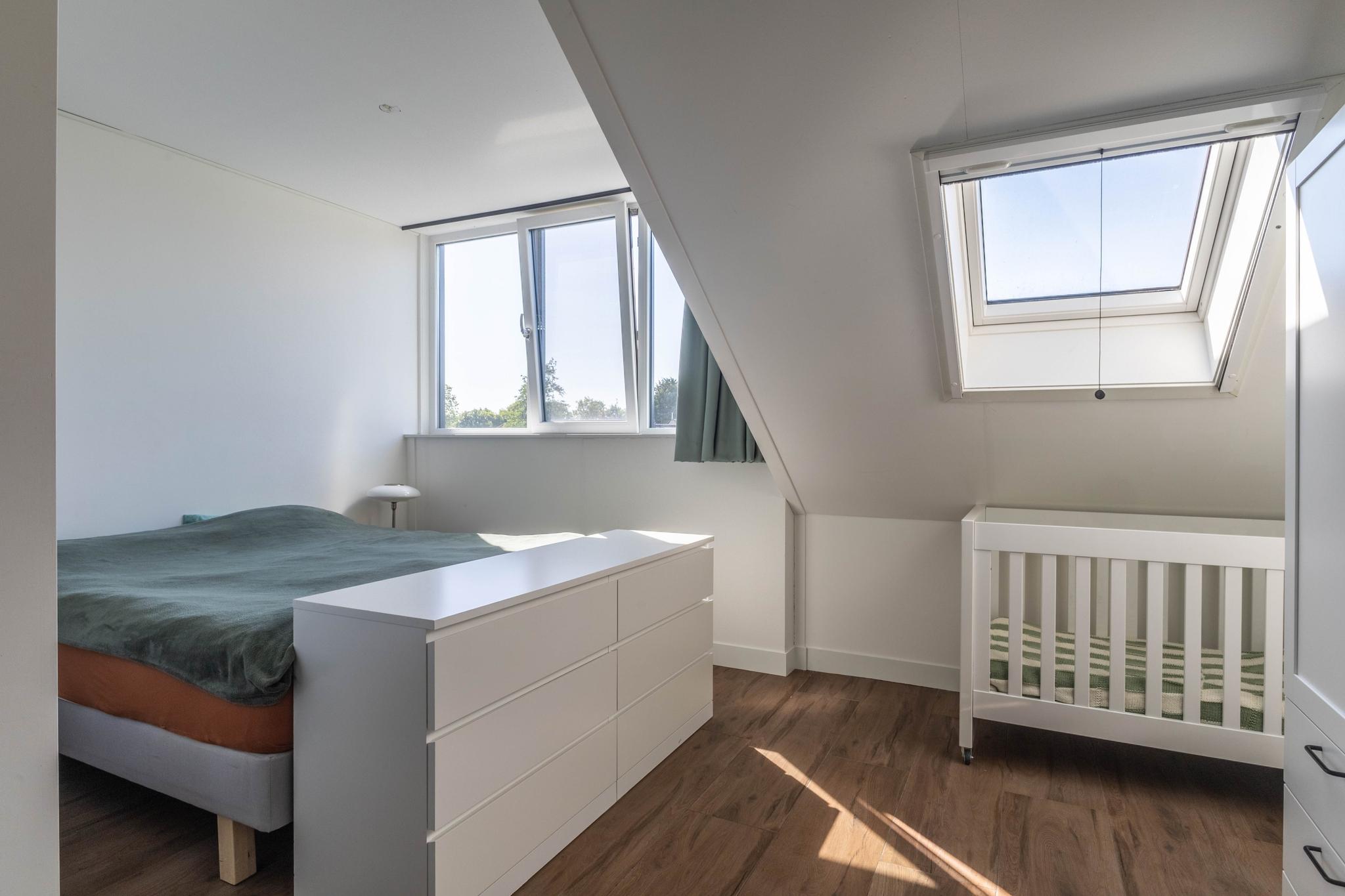 Op de eerste verdieping bevinden zich twee slaapkamers en de badkamer. De royale masterbedroom aan de achterzijde is een echte eyecatcher, met een dakkapel en dakraam die zorgen voor extra ruimte en licht. De tweede slaapkamer aan de voorzijde is perfect als 2e slaapruimte, werkkamer of hobbyruimte. De badkamer is voorzien van een douche, wastafel en een tweede toilet en is uitgevoerd met zwarte vloertegels en witte wandtegels.