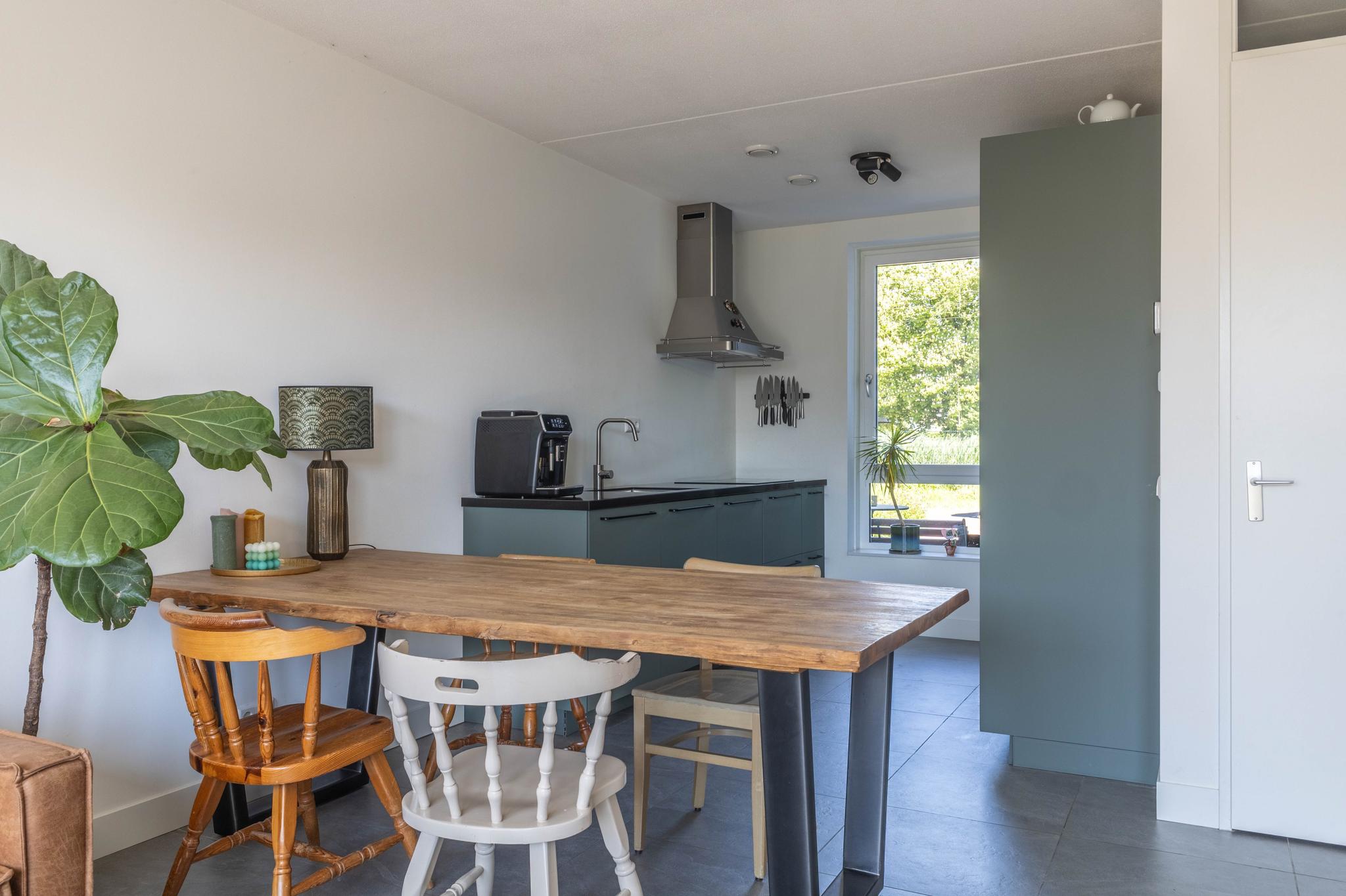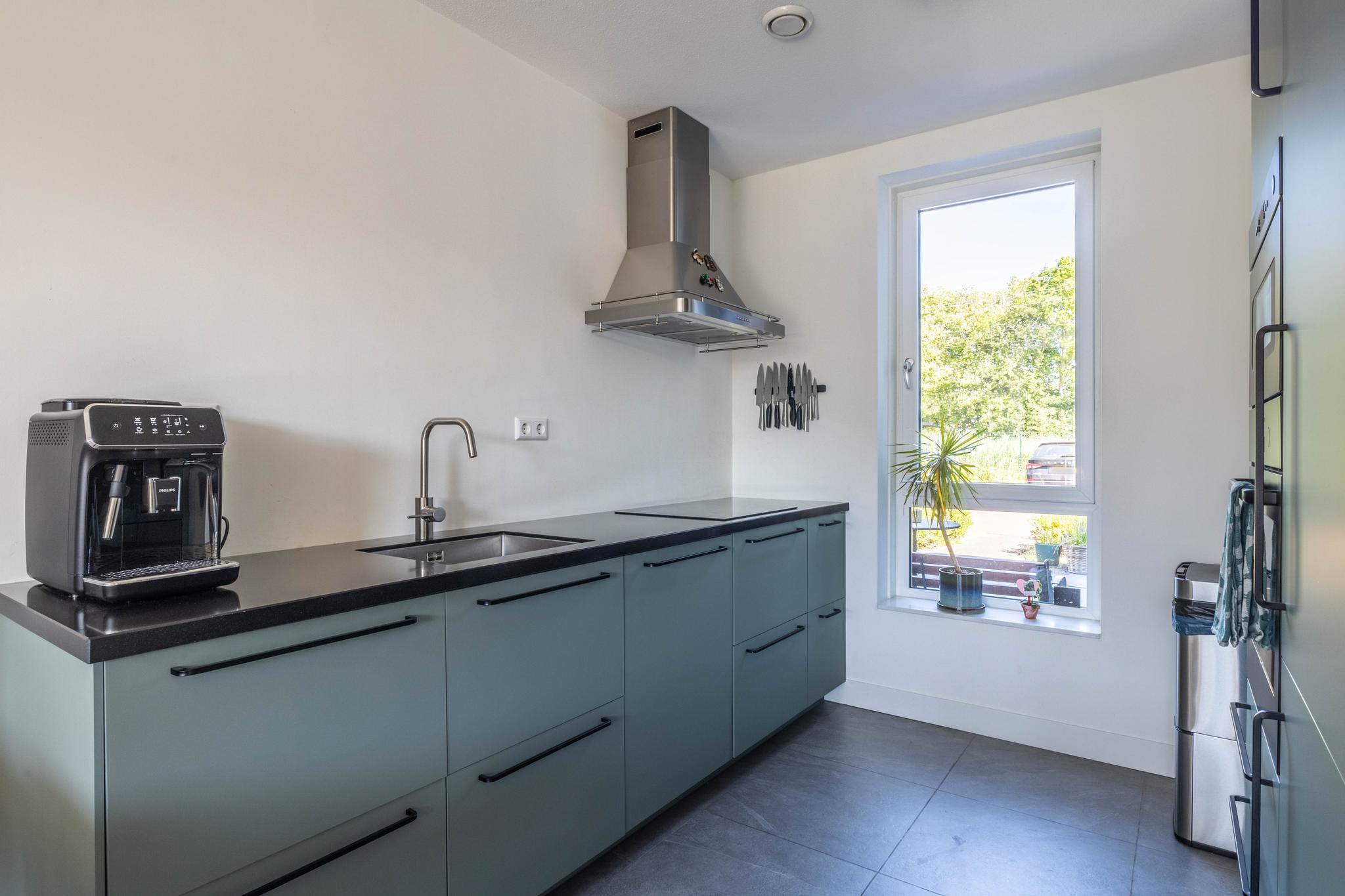 De open keuken aan de voorzijde heeft een praktische opstelling met twee rechte opstellingen die tegenover elkaar geplaatst zijn. Hier vindt u alle benodigde inbouwapparatuur, zoals een koelkast, vrieskast, oven, magnetron, inductiekookplaat, afzuigkap en vaatwasser. Daarnaast is er voldoende opbergruimte voor uw keukenspullen en boodschappen.