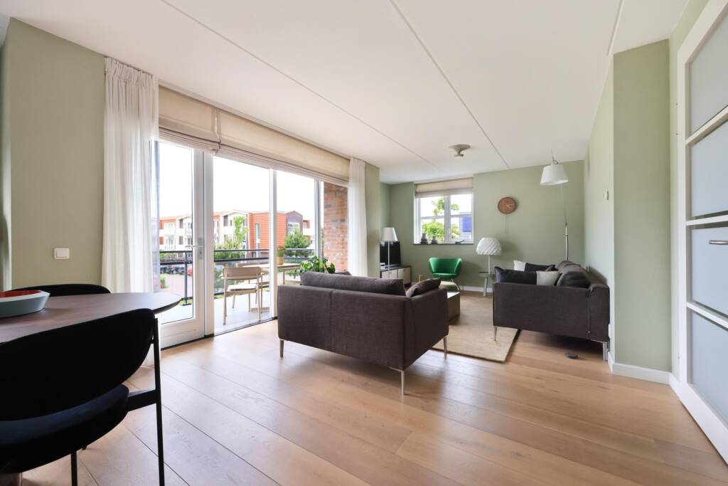 Uw jas kunt u kwijt in de ruime hal, dan door naar de royale woonkamer. De grote raampartijen zorgen voor veel lichtinval en leuk uitzicht. Er is meer dan genoeg ruimte voor een groot bankstel en een royale eettafel met stoelen. De wanden zijn afgewerkt in een lichte kleurstelling en op de vloer ligt een eiken houten vloer die voor een warme woonsfeer zorgt. Tevens is er een loopdeur naar het balkon. Het balkon op het westen biedt voldoende plek voor een loungeset, waar u kunt genieten van uw ontbijt of een drankje in de avondzon.