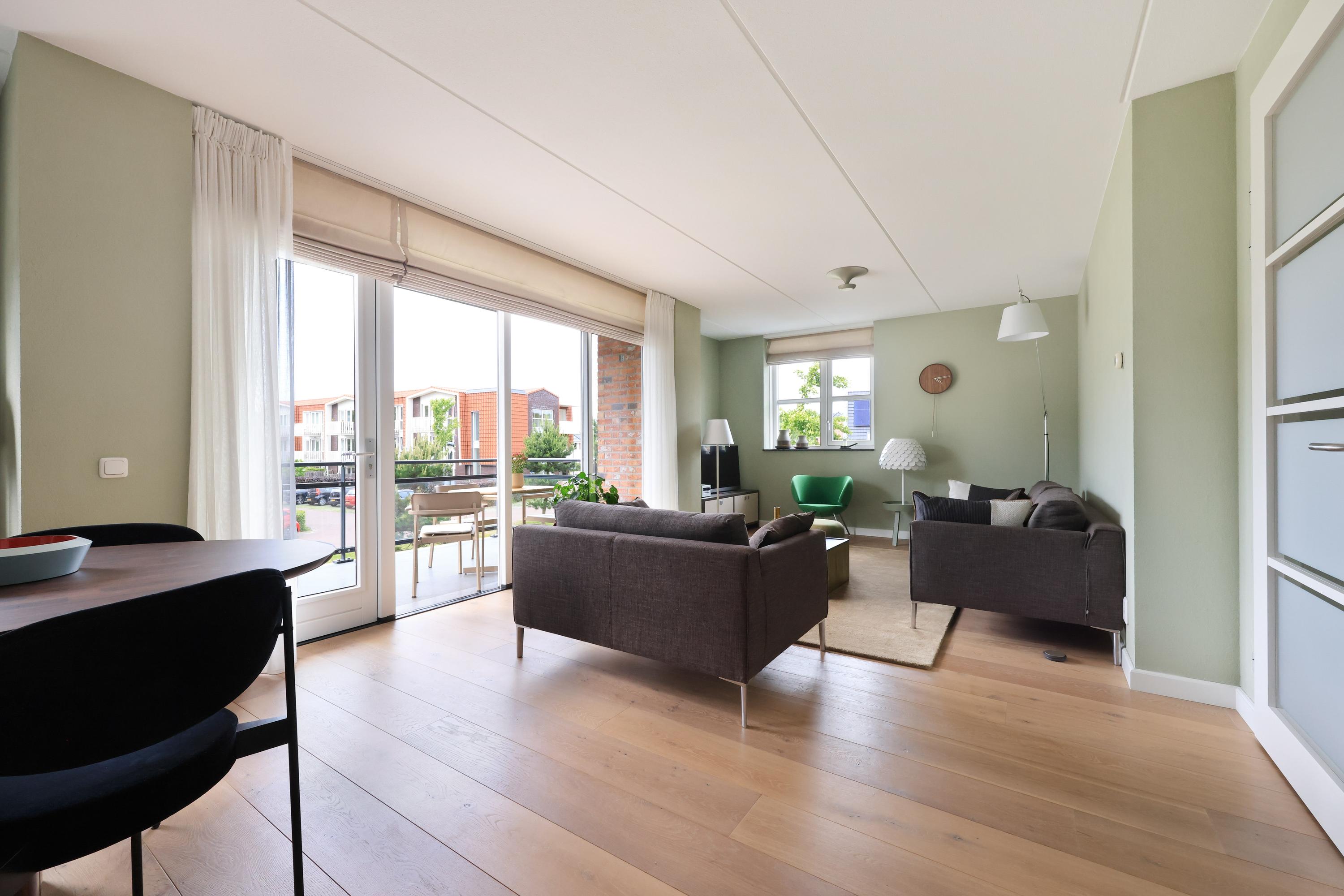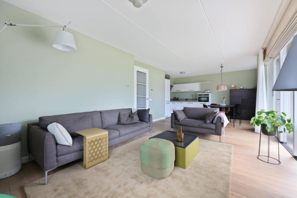 Door de hoekligging heeft de woonkamer aan drie zijden extra lichtinval. De lichte eikenvloer, de openslaande deur naar het balkon op het westen zorgen voor een sfeer die u echt moet voelen. Een schitterende grote ruimte, die van top tot teen juist is ingedeeld en alle ruimte wordt zeer goed benut.
