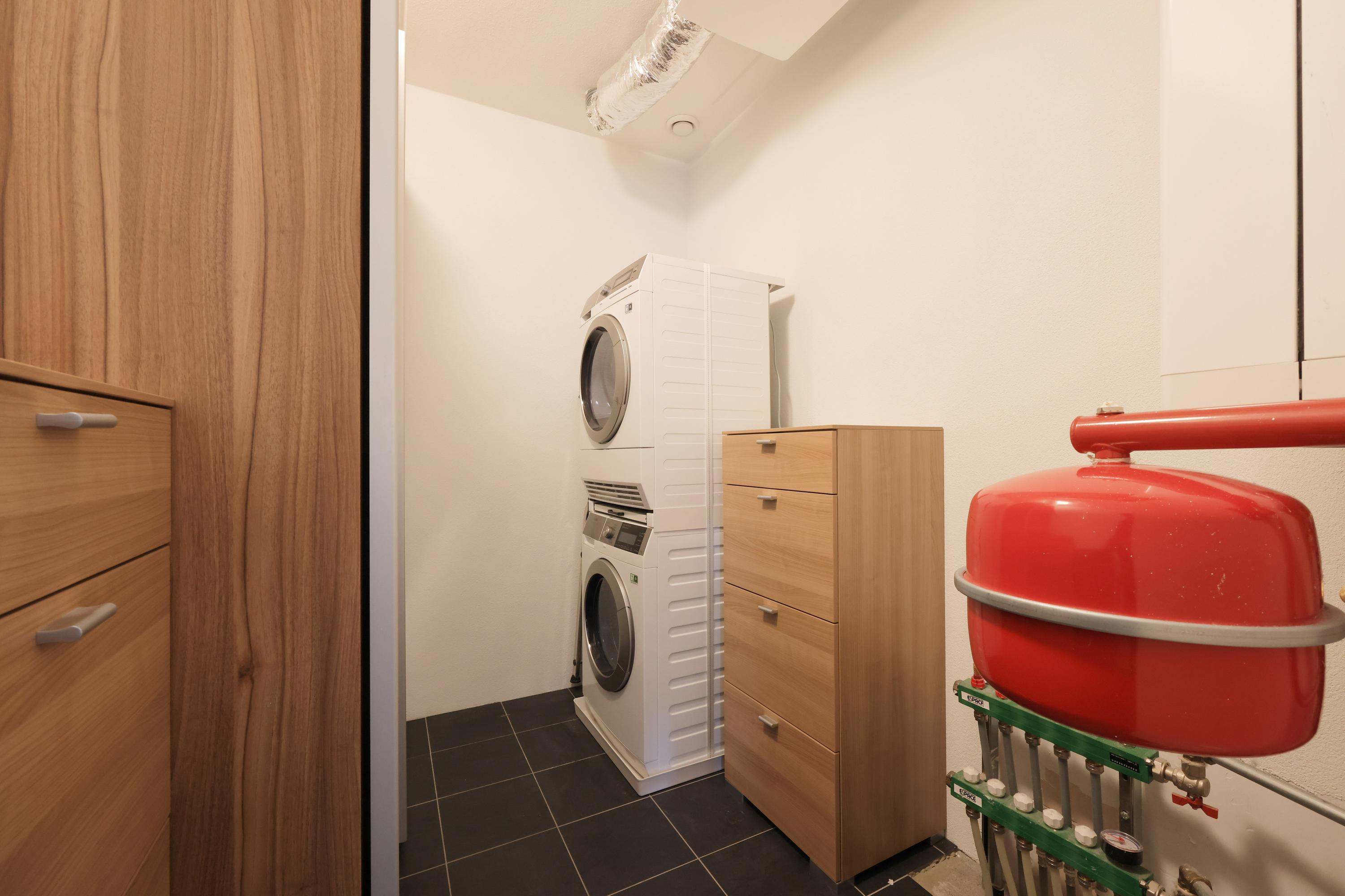 In de berging de wasmachine en droger aansluiting en de opstelling van de CV-ketel.