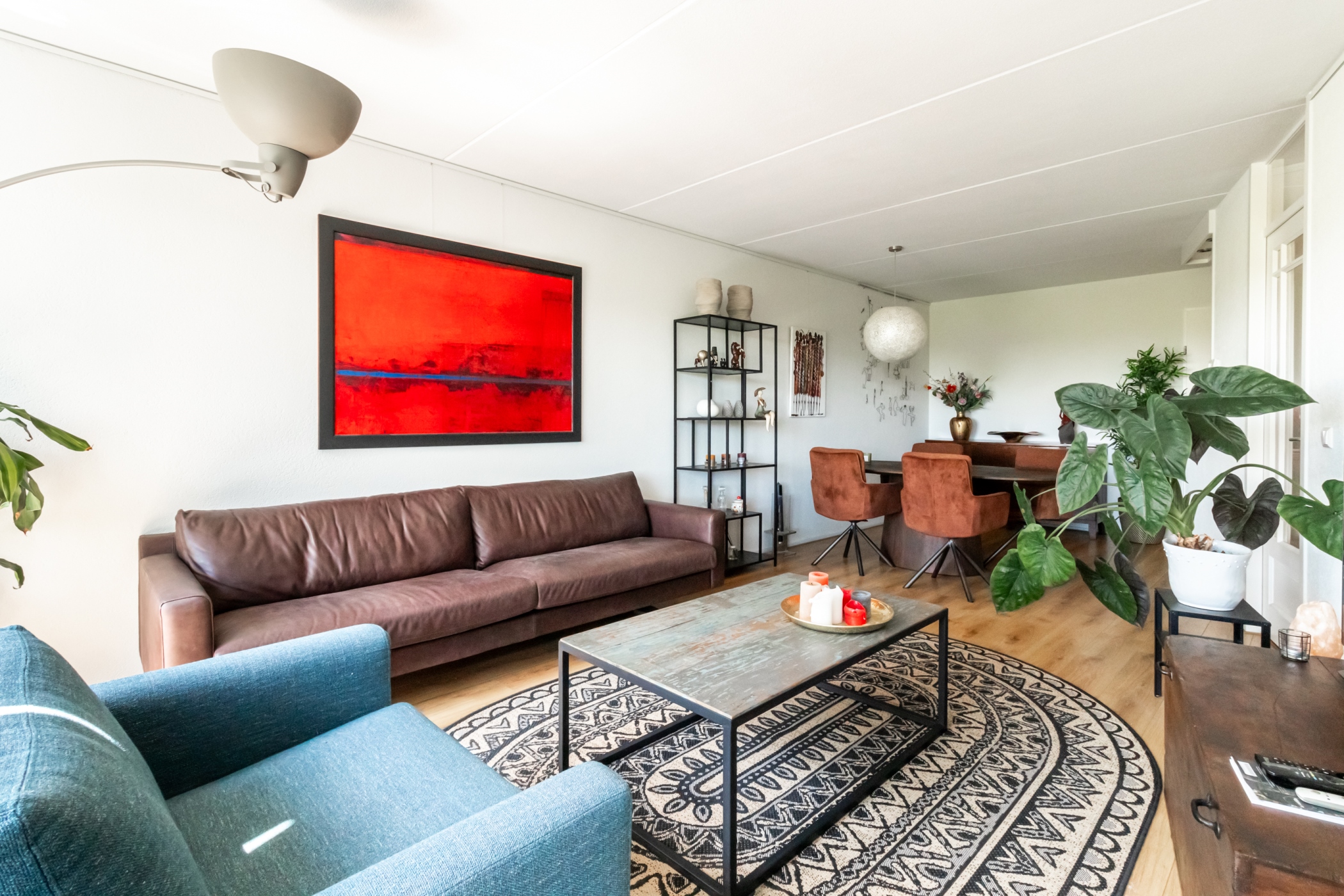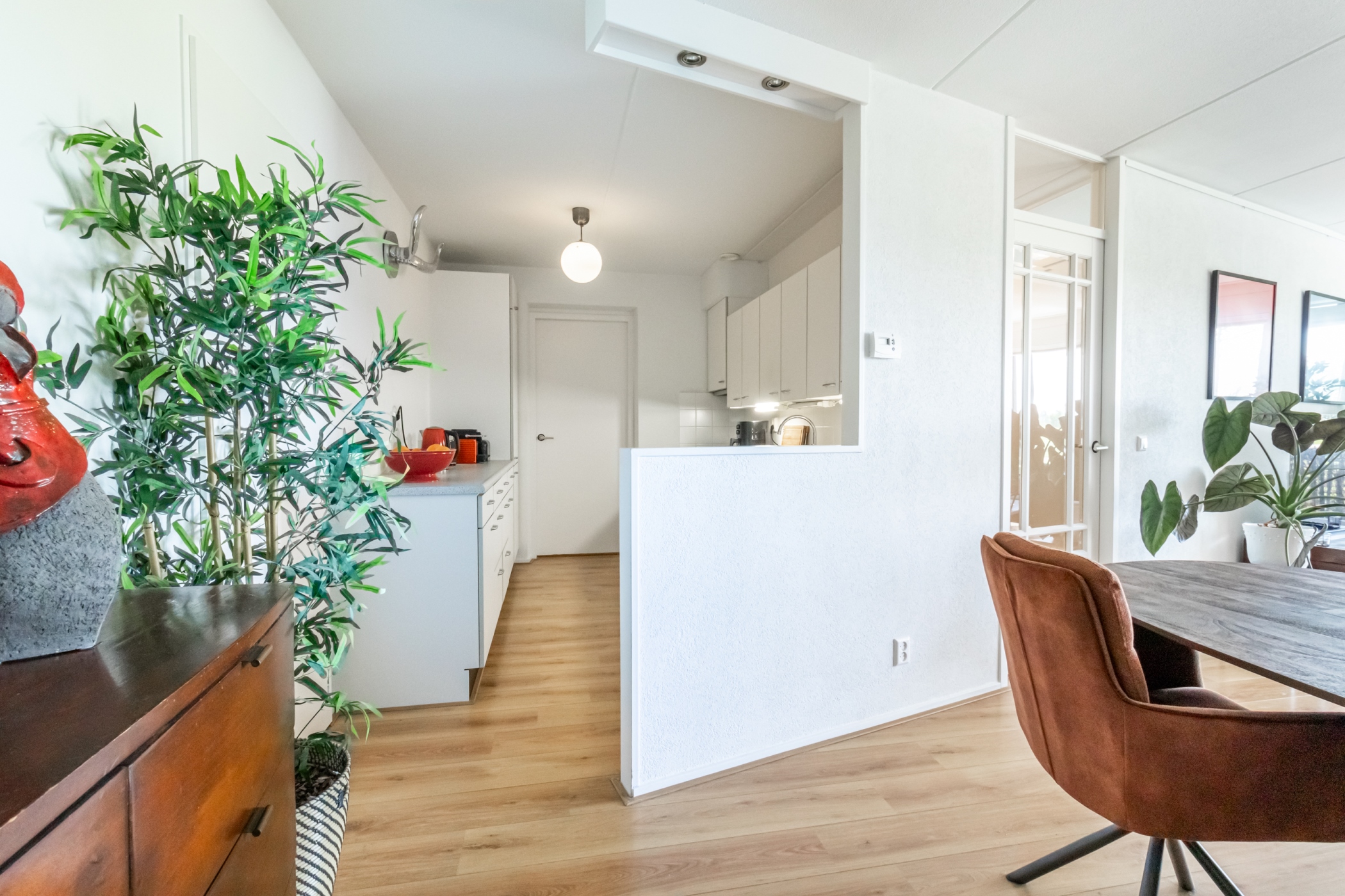 Vanuit de hal loopt u door naar de woonkamer. Bij binnenkomst in de woonkamer zult u versteld staan van de enorme ruimte en de aangename hoeveelheid licht. De lichtinval is te danken aan de grote ramen, die dit appartement te bieden heeft. Vanuit de woonkamer kunt u via de openslaande deur het zonnige terras bereiken gelegen op het zuiden. Geniet van het terras waar u gemakkelijk een comfortabele loungebank kwijt kunt voor gezellige avonden met vrienden of juist heerlijke rustig momenten. Dit is de perfecte plek om te genieten van het buitenleven!