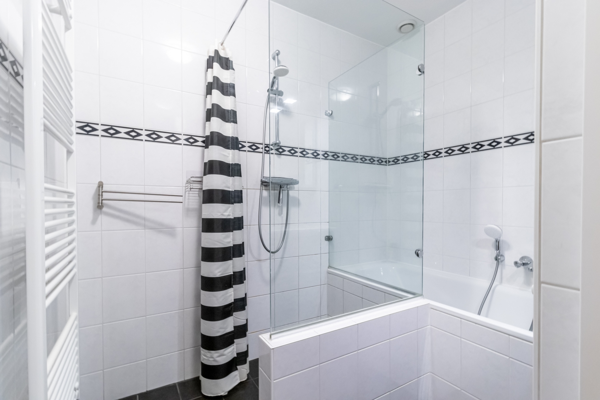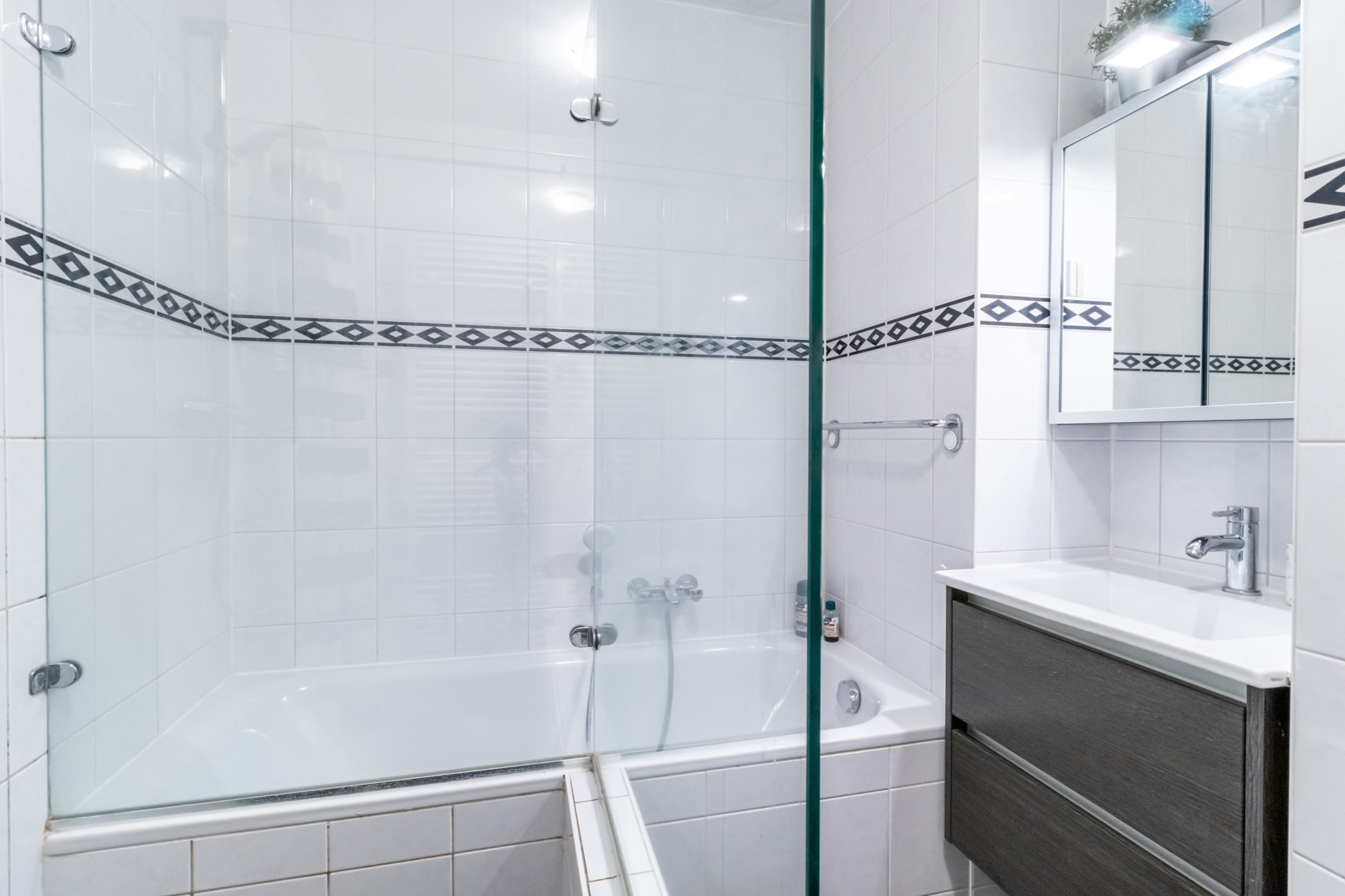 De badkamer is tot aan het plafond betegeld, waardoor schoonmaken eenvoudig wordt. Of het nu gaat om een snelle douche in de ochtend of een ontspannend bad na een lange dag, hier vind u alles wat je nodig heeft. Een wastafelmeubel biedt opbergruimte voor de dagelijkse benodigdheden.