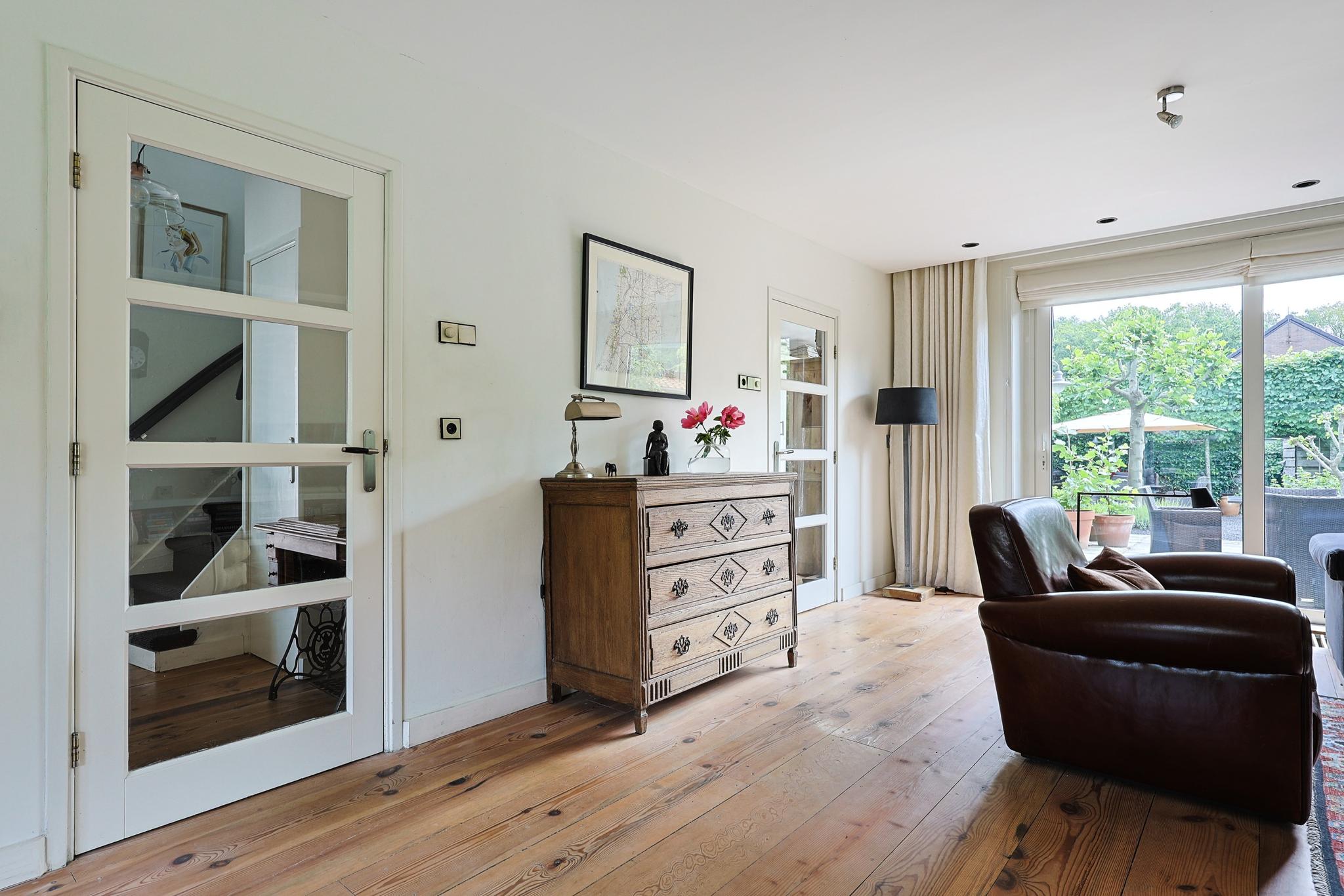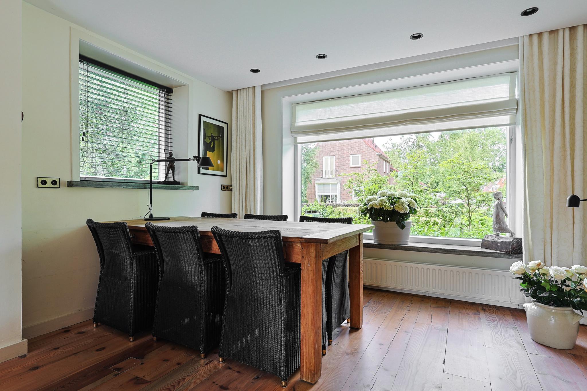 Eenmaal binnen in de royale lichte woonkamer wordt u omarmd door de warme ambiance van een oude massief grenenhouten vloer. De natuurlijke tinten van het hout creëren een rustgevende sfeer. De woonkamer is ruim van opzet en biedt een prachtig uitzicht over de van Vladerackenlaan, wat zorgt voor een gevoel van openheid en verbinding met de omgeving. Centraal in de woonkamer staat een sfeervolle houtkachel, die niet alleen warmte geeft maar ook bijdraagt aan een gezellige sfeer. Dankzij de grote schuifpui stroomt er veel natuurlijk licht binnen en heeft u direct toegang tot de tuin.