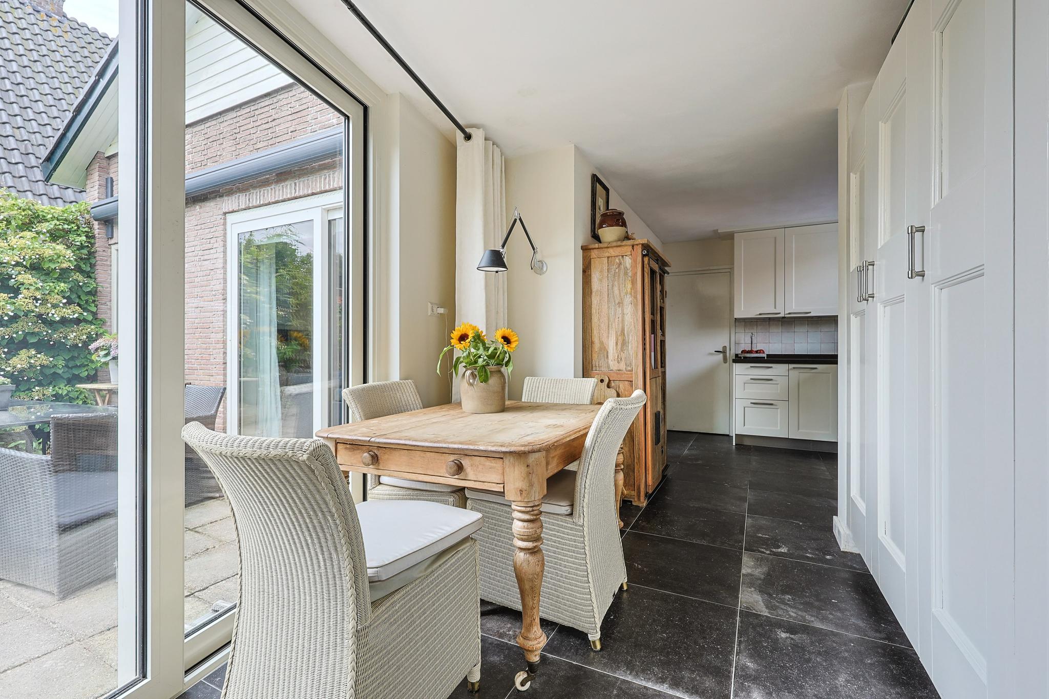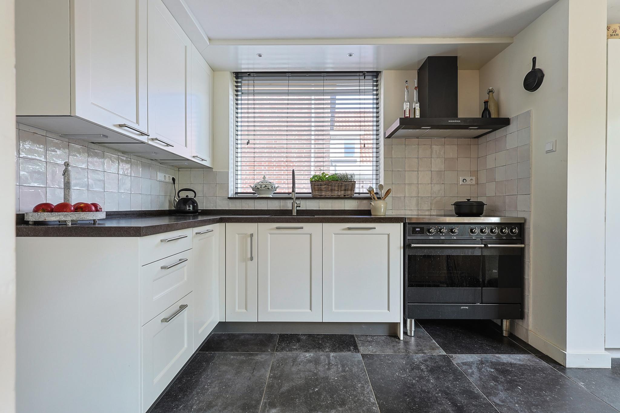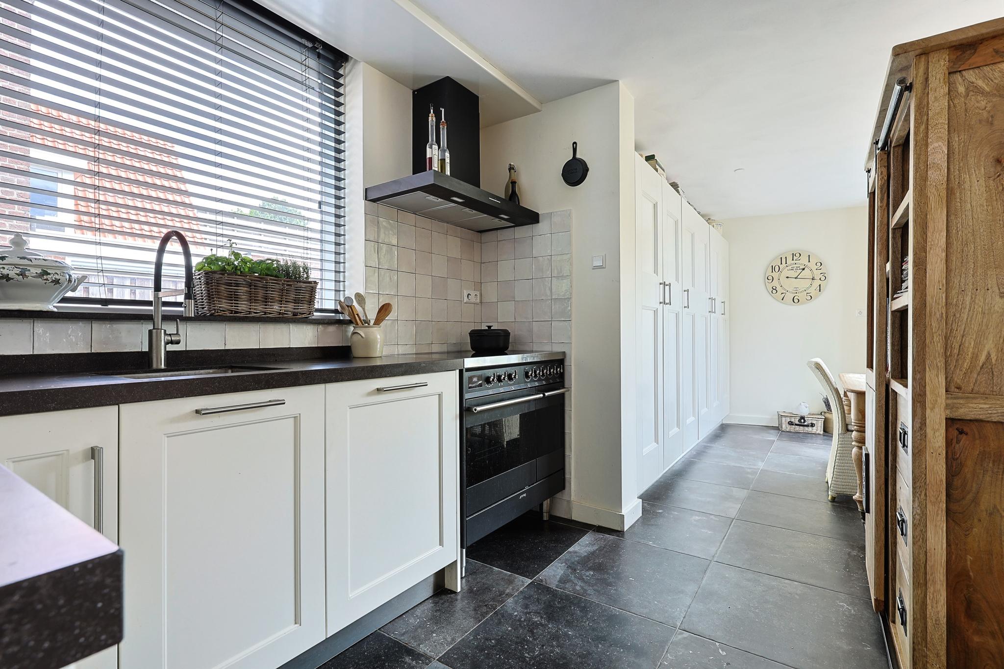 Een opvallend kenmerk is de grote kastenwand met aansluitingen voor de wasmachine, droger en de koel-vriescombinatie, die zorgt voor veel opbergruimte en een opgeruimd geheel. De keuken biedt verder toegang tot een handige kelder, ideaal voor extra opslag of het bewaren van uw voorraad. Bovendien is de keuken voorzien van een schuifpui die direct toegang geeft tot de tuin. Omdat de keuken beschikt over vloerverwarming ervaart u altijd comfort en een aangename warmte.
