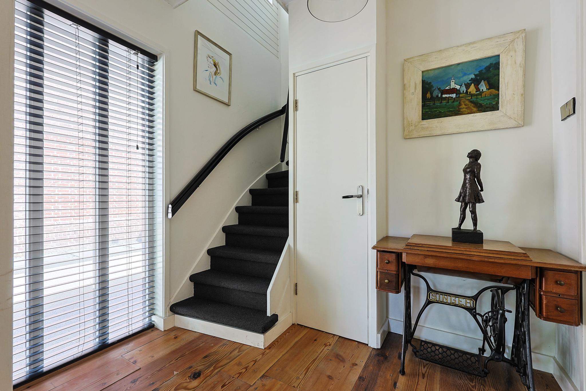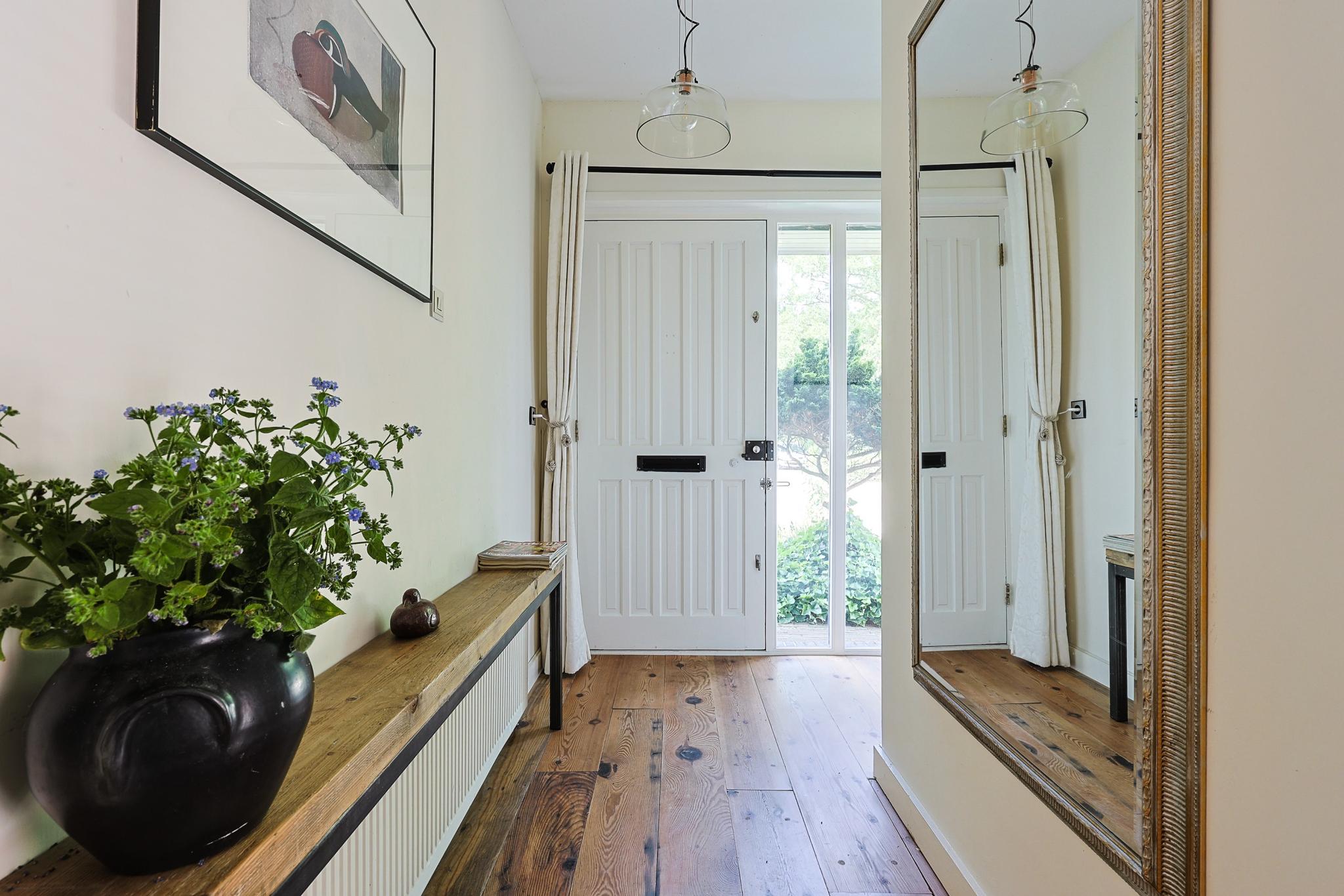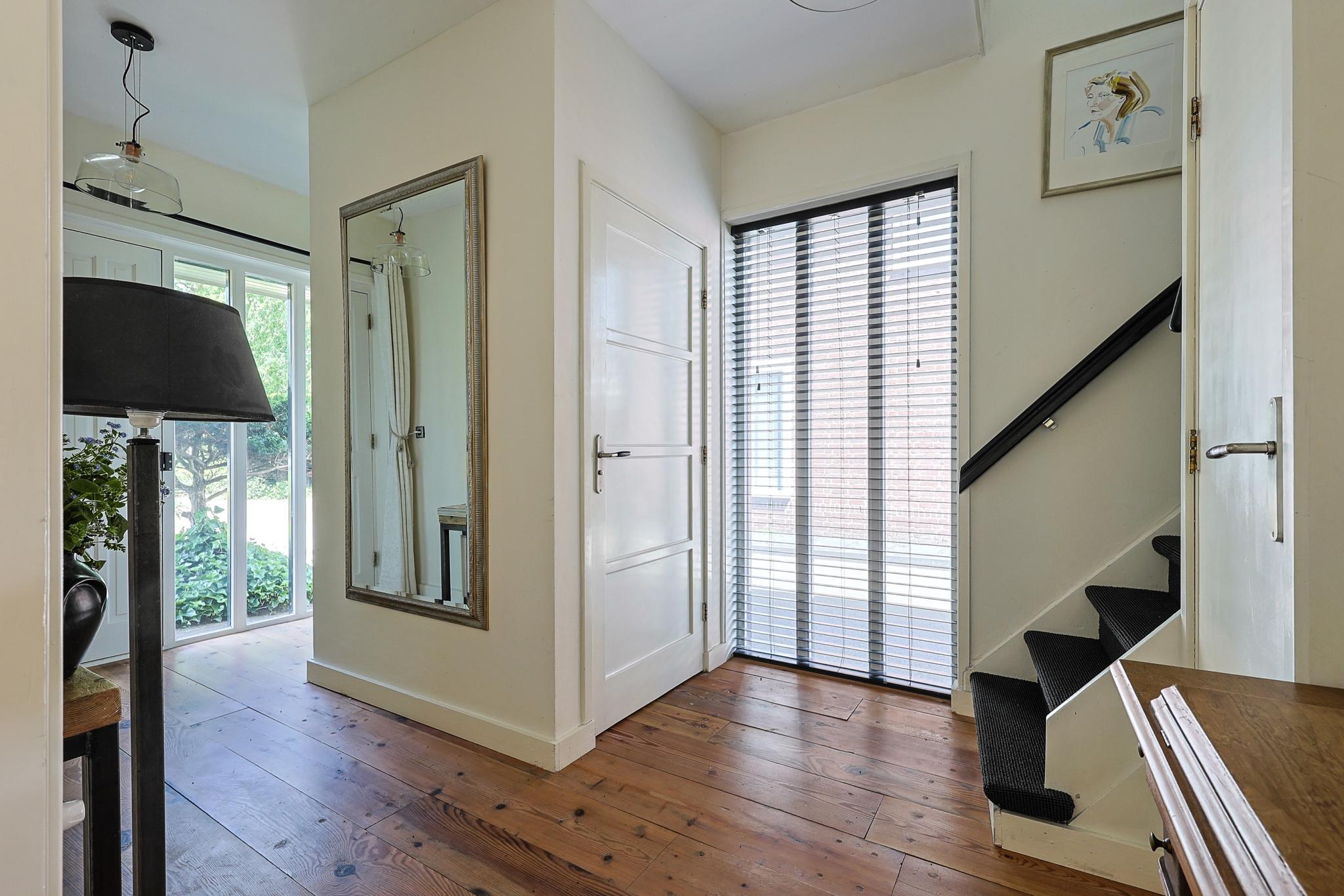 Via de ruime voortuin komt u bij de entree. Bij het betreden van de woning wordt u verwelkomd in een hal die rijkelijk aanvoelt en ruim van opzet is. Een garderobenis biedt een handige plek om jassen en schoenen op te bergen, waardoor de hal netjes en opgeruimd blijft. Vanuit de hal heeft u toegang tot het toilet, de eerste verdieping en de woonkamer.