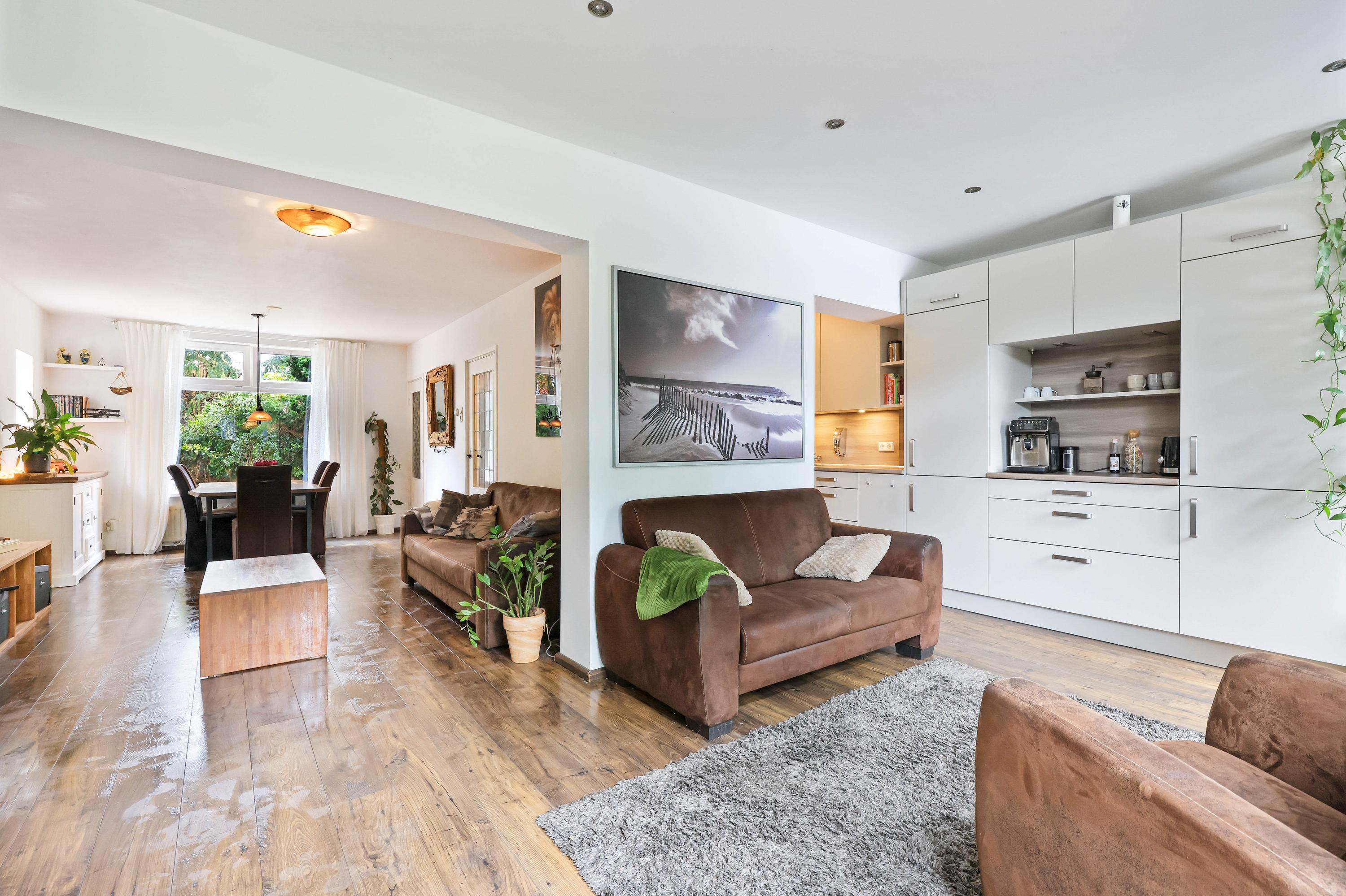 Bij binnenkomst komt u in de hal die toegang biedt tot het toilet, de woonkamer én de keuken. De woonkamer is volledig gestukt en strak afgewerkt, waarbij de inbouwspotjes zorgen voor een moderne en sfeervolle uitstraling. Dankzij de grote raampartijen geniet u hier niet alleen van een fijne lichtinval, maar ook van fraai zicht op de prachtige tuin. Op de vloer ligt een nette laminaatvloer in houtlook. Aan de achterzijde bevindt zich de ruime uitbouw met openslaande tuindeuren naar de tuin, waar de open haard centraal staat – een heerlijke plek om te genieten.