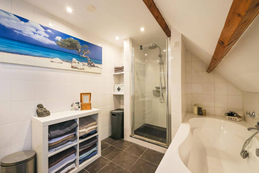 Aan de voorzijde vindt u de badkamer die is voorzien van een dakkapel waardoor er veel licht en ruimte is. Hier kunt u genieten van een ligbad, een ruime inloopdouche met stortdouche en een net wastafelmeubel. Een comfortabele ruimte waar ontspanning centraal staat. Naast de badkamer bevindt zich een aparte kamer met een toilet en de aansluitingen voor wasmachine en droger – praktisch en functioneel ingedeeld. Bovendien is er nog een vliering aanwezig, ideaal voor het opbergen van spullen die u niet dagelijks nodig heeft.